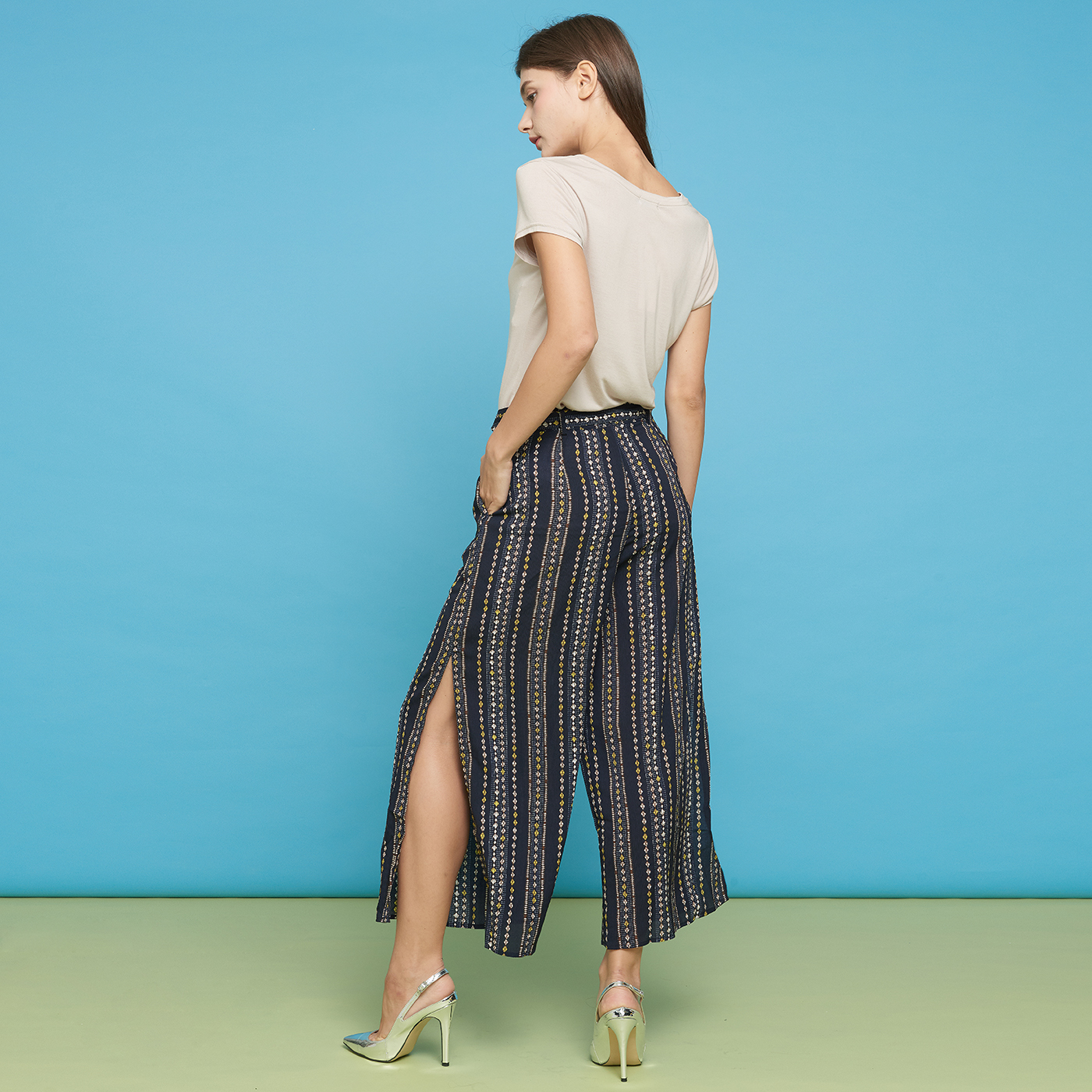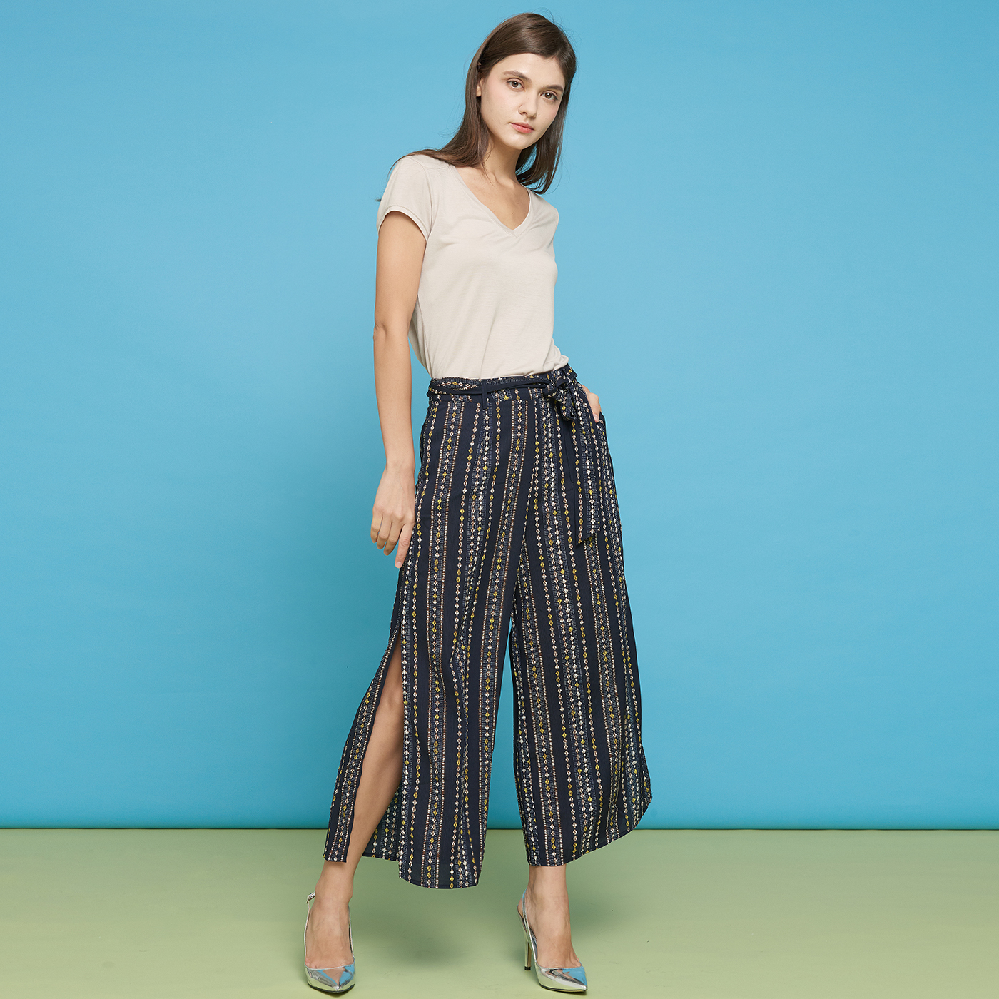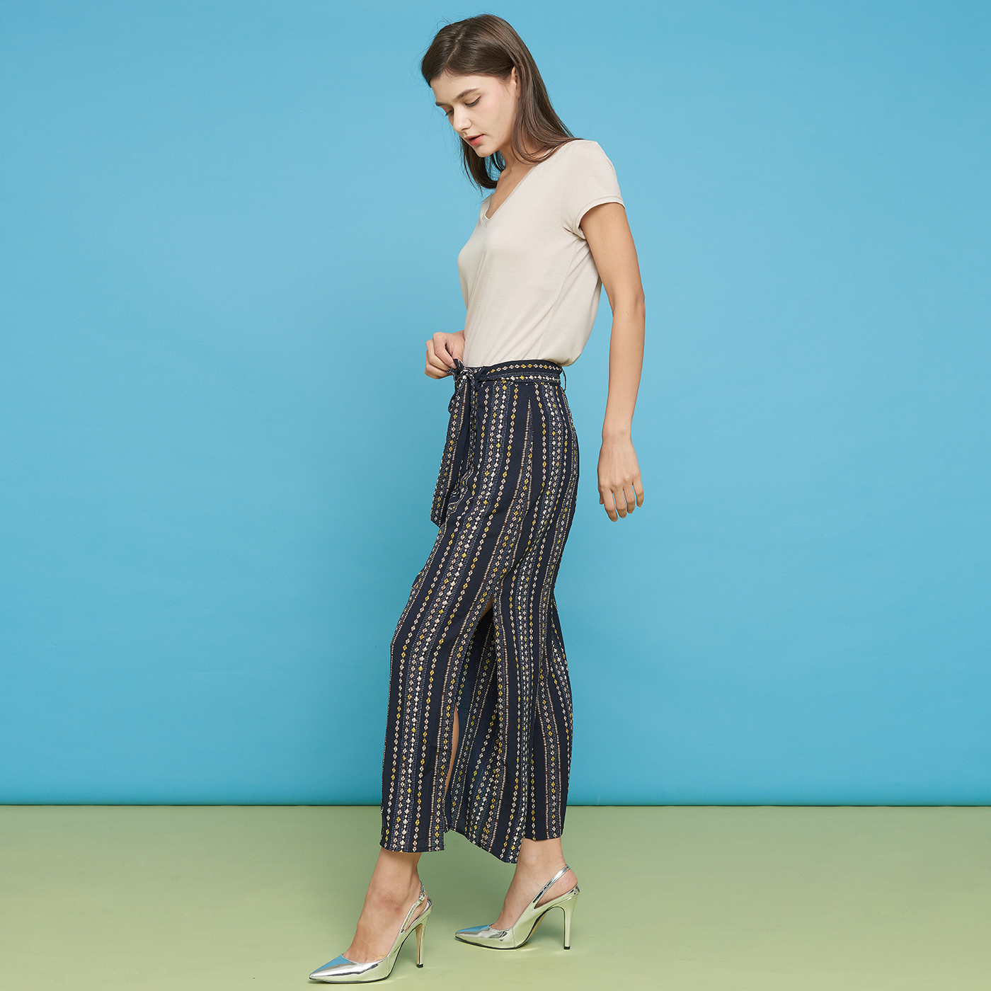 옆트임이 시크한 스트라이프 롱 팬츠입니다.