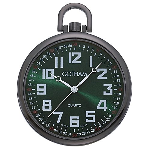 -. Binding : Watch -. Brand : Gotham -. Department : Mens -. Feature : Classic open face gun-tone pocket watch with slim polished brass case suitable for engraving / Rich green sun-ray railroad style dial with black 12 and red 24 hour markers / Precision Japanese analog quartz movement / Includes matching 14" curb pocket watch chain with belt clip attachment / Arrives with deluxe draw string pouch and gift box, operating instructions and lifetime warranty card -. Label : Gotham -. Manufacturer : Gotham -. Model : 4331782431 -. MPN : GWC15027BG -. PackageQuantity : 1 -. PartNumber : GWC15027BG -. ProductGroup : Watch -. ProductTypeName : WATCH -. Publisher : Gotham -. Studio : Gotham -. Title : Gotham Men's Gun-Tone Slim Railroad 24 Hour Open Face Quartz Pocket Watch # GWC15027BG