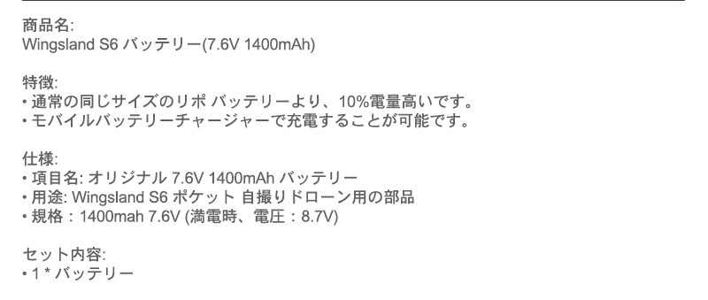 商品名: ・Wingsland S6 バッテリー(7.6V 1400mAh) 特徴: ・通常の同じサイズのリポ バッテリーより、10%電量高いです。 ・モバイルバッテリーチャージャーで充電することが可能です。 仕様: ・項目名: オリジナル 7.6V 1400mAh バッテリー ・用途: Wingsland S6 ポケット 自撮りドローン用の部品 ・規格:1400mah 7.6V (満電時、電圧:8.7V) セット内容: ・バッテリー×1 備考: Wingsland S6バッテリーは海外からの輸入品となりますので、パッケージに 汚れや傷、破損などがある場合があり、その際は簡易パッケージに 変更させて頂く可能性があります。予めご了承ください