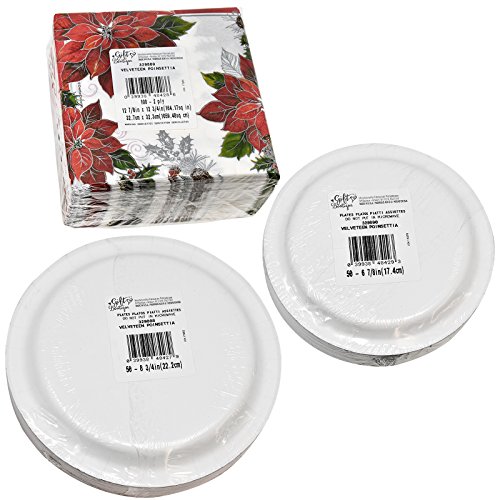 Studio : Gift Boutique Publisher : Gift Boutique Binding : Health and Beauty Product Description Gift Boutique Holiday Poinsettia Tableware Kit Includes 50 8 5/8" Dinner Plates, 50 6 5/8" Dessert Plates and 100 Luncheon Napkins. Exclusive Elegant Poinsettia Design adds that special touch to your winter Holiday family gathering or any occasion. Dinner Plates are 5 8/8". Dessert Plates measure 6 5/8". Luncheon Napkins measure 6.5" x 6.5" when folded. Plates and napkins are made in the USA with high quality materials. Stock up with bulk quantity of quality plates and napkins to make sure you have enough for the Holiday season. 0