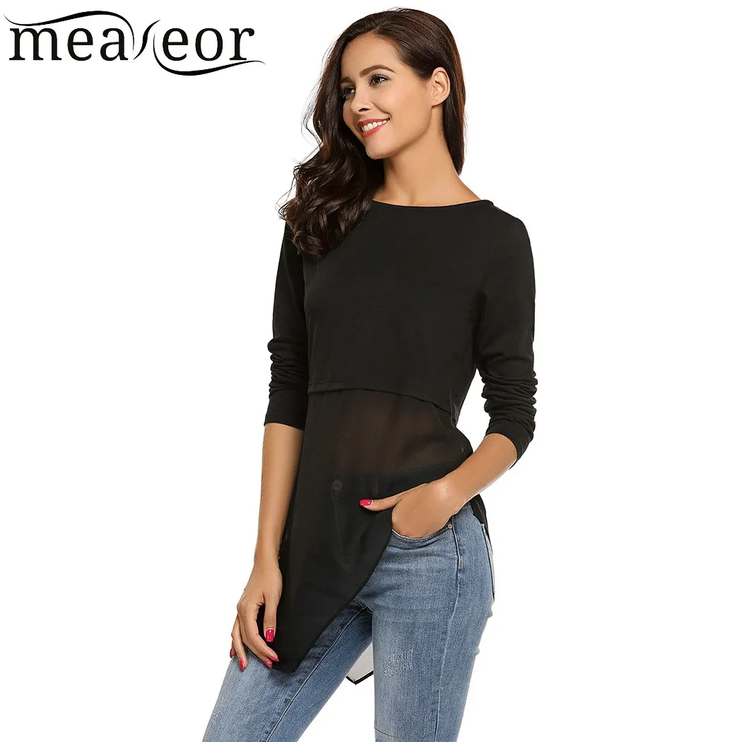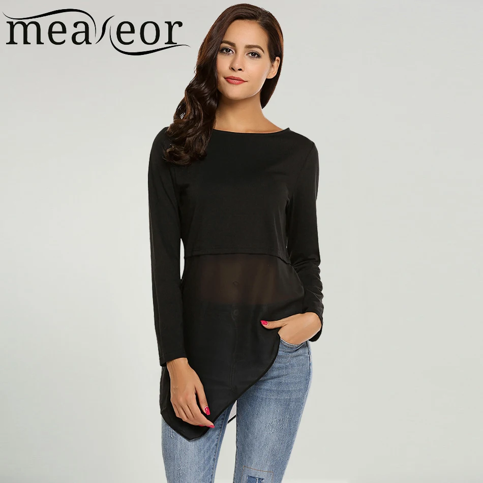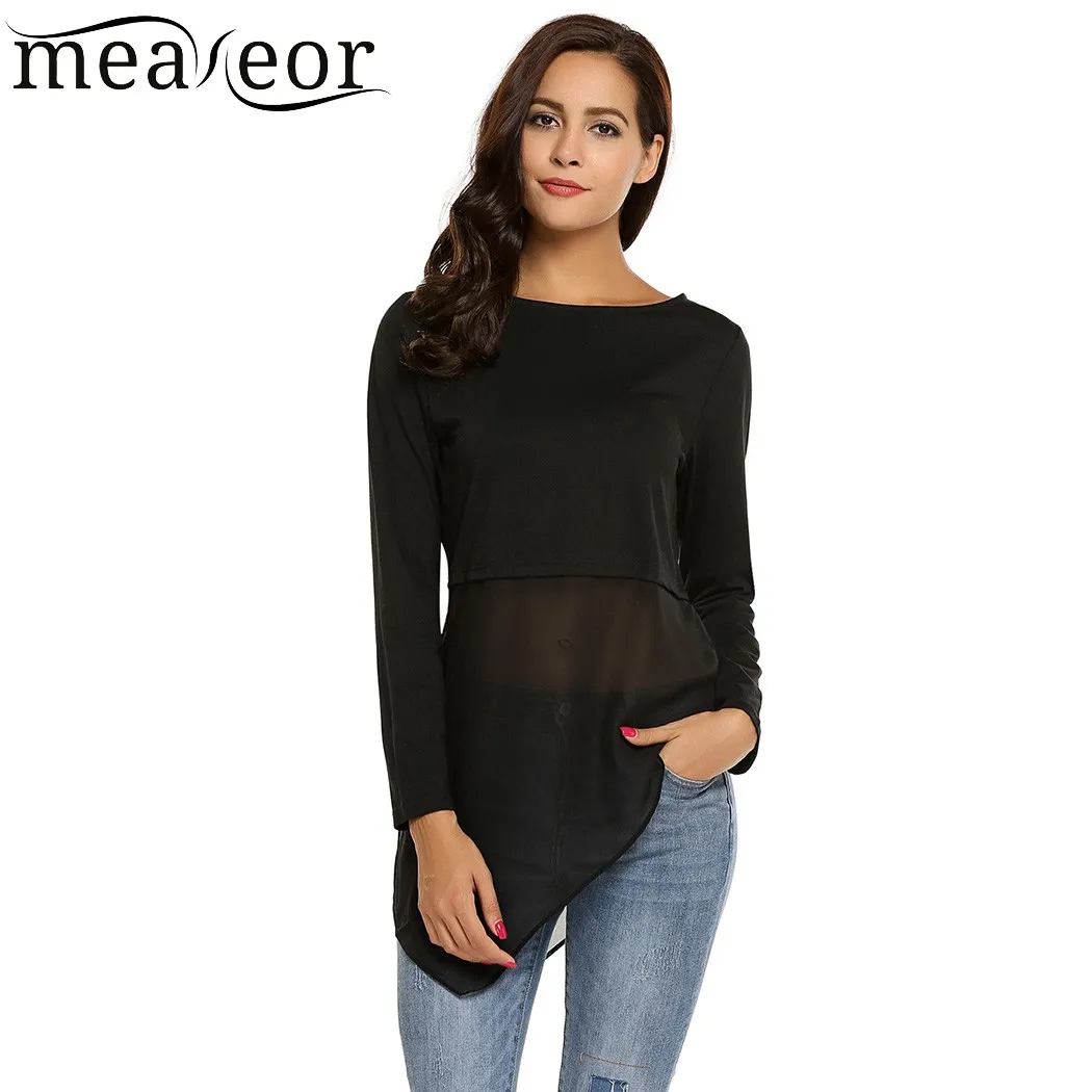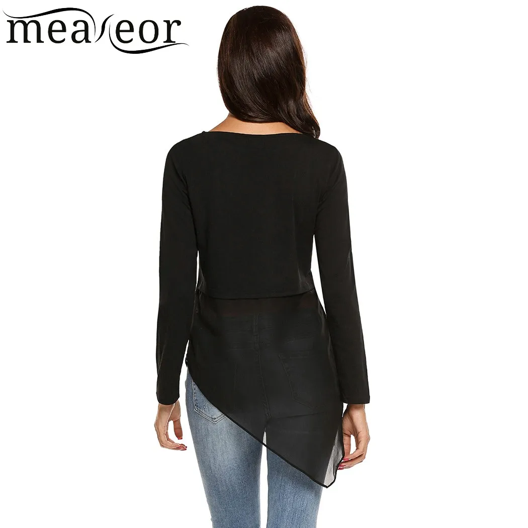 Item Style:Meaneor Mesh Patchwork O-Neck Long Sleeve T-Shirt