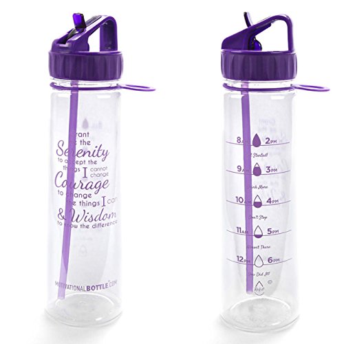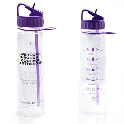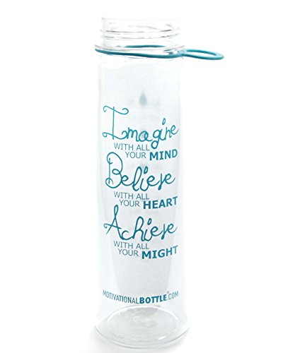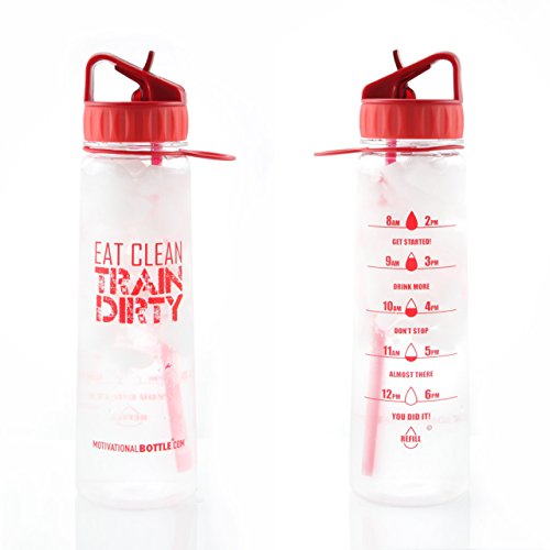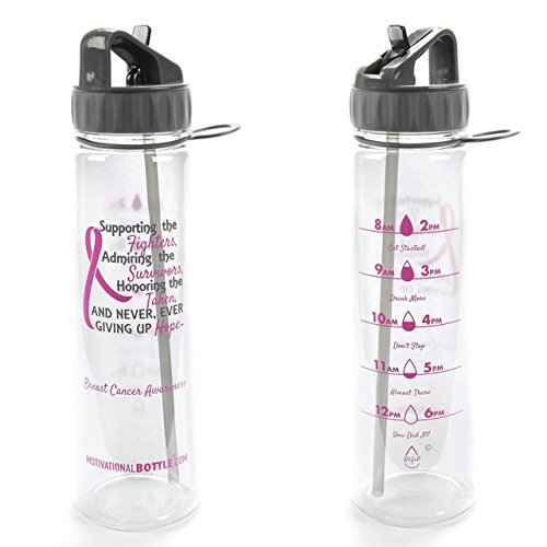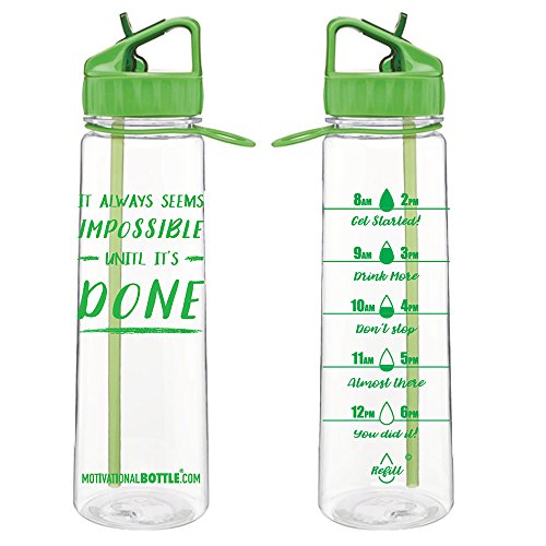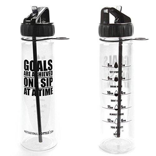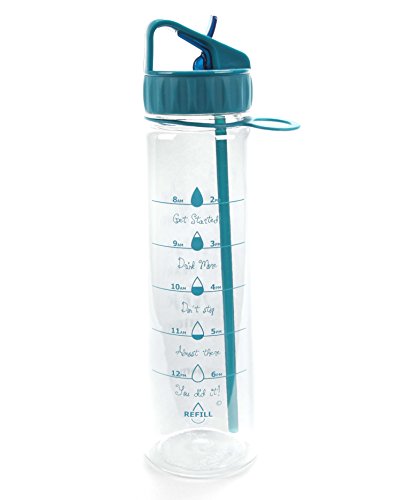 Our Straw Motivational Bottle® features a motivating quote and unique timeline©, measured to keep track of your daily water intake. This bottle holds 30oz of water, fits easily in the hand and is compatible with larger cup holders. The flip straw top makes it easy to drink on the go. The unique design, durable construction and BPA-Free materials make this bottle perfect to take from work to the gym or even in the car. The straw is a convinient way for no more spills! BOTTLE FEATURES: Motivational Quote Unique Timeline© BPA- Free Plastic Carrying Loop Silicone Grip Flip- Up Straw Copolyester Material Plastic BOTTLE CAPACITY: 30 ouncesFeature