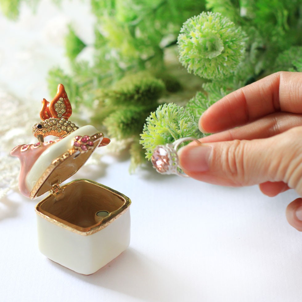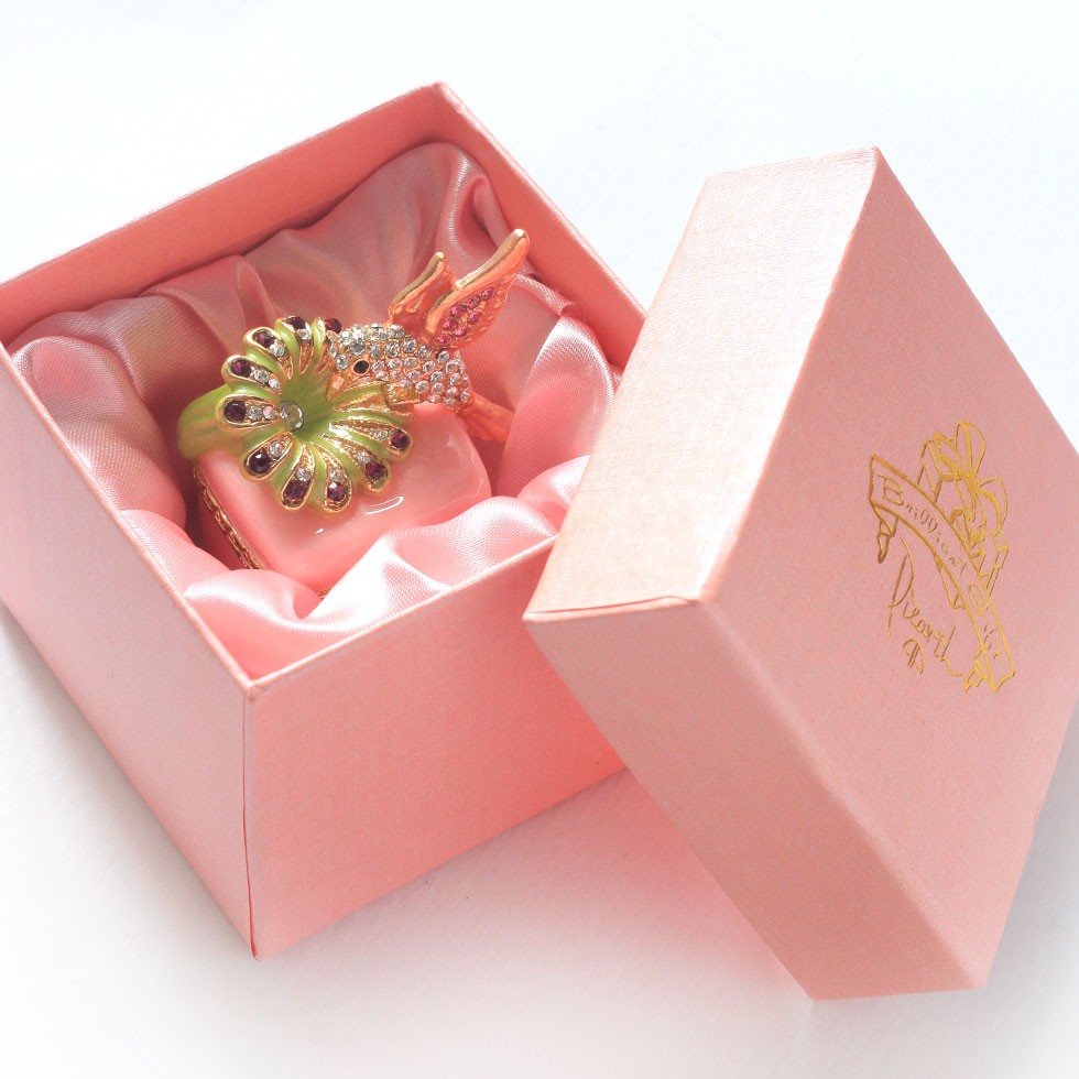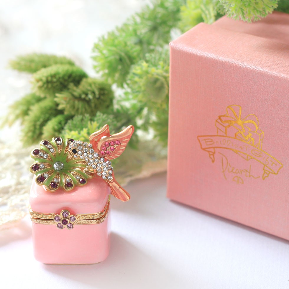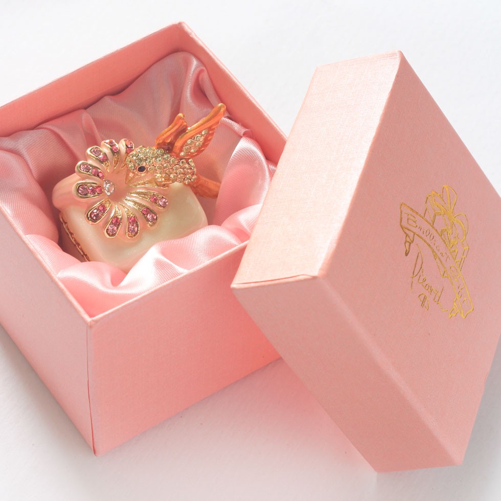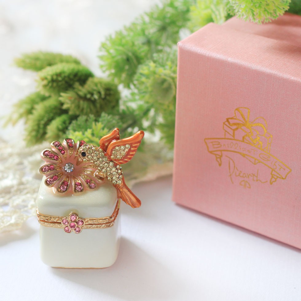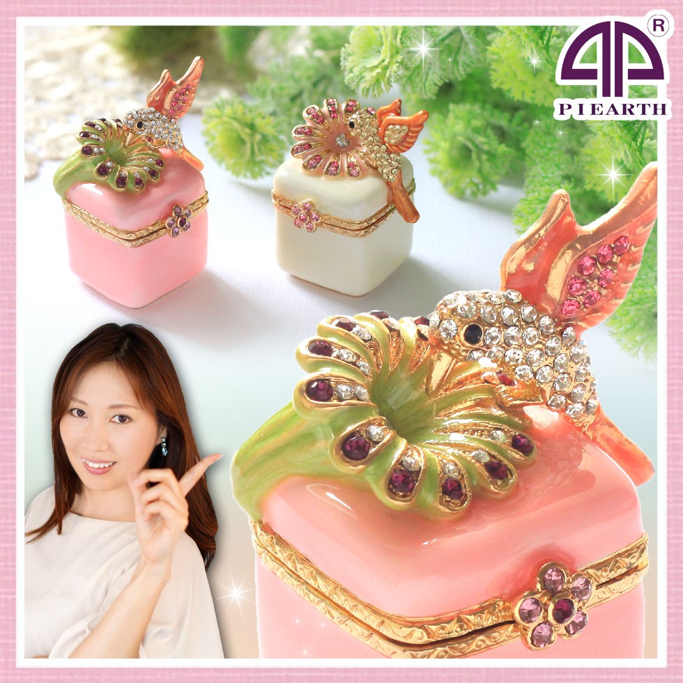 | ジュエリーボックスと言えば、指輪やピアス、ネックレスなどのアクセサリーを入れる引き出し型のケースを思い浮かべる方が多いかもしれません。 ピィアースのジュエリーボックスは、動物や花などをモチーフに作られ、合金製でずっしりとした重さがあります。また高品質のクリスタルガラスを贅沢に使用。まるでジュエリーボックスそのものが宝石のような、高級感溢れる仕上がりです。 小物入れとしても使えるように開閉口には磁石が取り付けてあり、アクセサリーなどなくしやすいアイテムの収納ができます。キラキラと美しく輝く宝石箱は、そのまま飾って楽しめるインテリア雑貨として多くの方に愛されています。 国内トップクラスのジュエリーボックスメーカーであるピィアースは、2004年ごろから本格的に宝石箱の製造を始め、現在のジュエリーボックスはなんと300種類以上。大規模展示会でもご好評いただいており、全国有名百貨店でも販売されています。 自社工場でひとつひとつ丁寧に手作りし、原型作成、研磨、加工、着色、小さなクリスタルガラスの取り付けなども全て手作業で行われるこだわりのハンドメイド品。完成後は厳しい検品の後、丁寧に梱包作業をしお客様にお届けしております。 ピィアース商品は、全国有名百貨店および全国有名宝石店チェーンにてお取り扱いいただいている高品質商品です。 ★自分へのご褒美に…コレクションして並べて飾ると、さらにかわいらしさUP! ★恋人へのプレゼント…中にアクセサリーを入れて、サプライズな贈り物として ★家族への感謝ギフト…お母さんや姉妹へ、日頃のありがとうの気持ちを込めて ★誕生日プレゼント…お友達の喜ぶ顔が見たいから、いつもと違うキラキラギフトを ★小さな女の子へ…まるでお姫様が使っているようなキラキラ宝石箱は女の子の憧れ! |