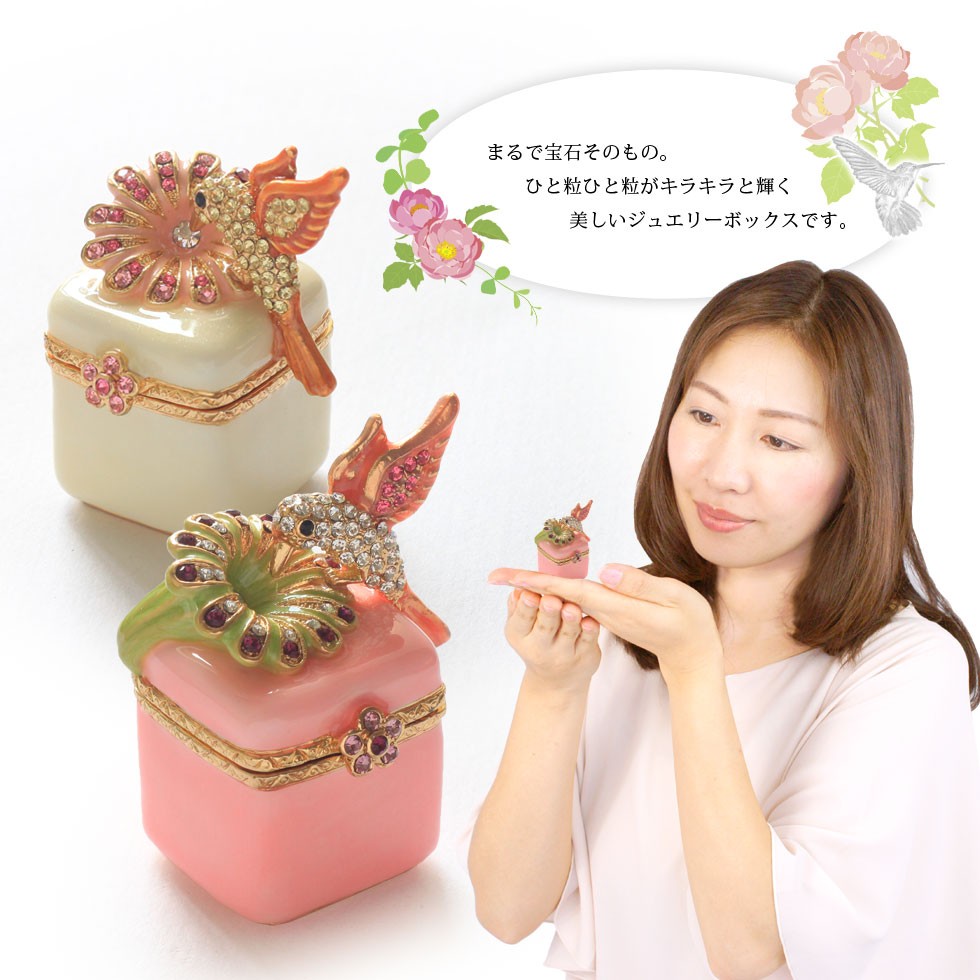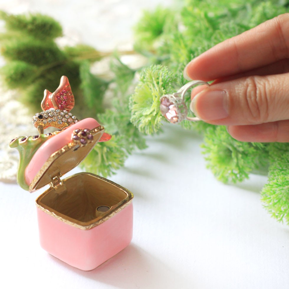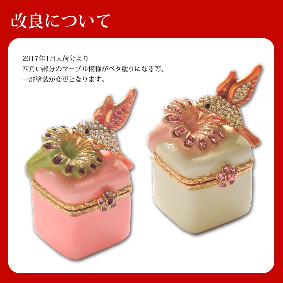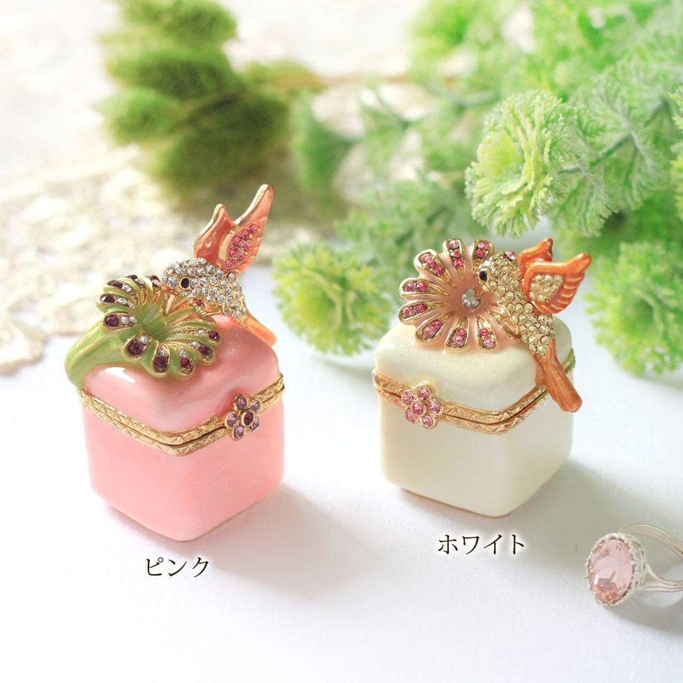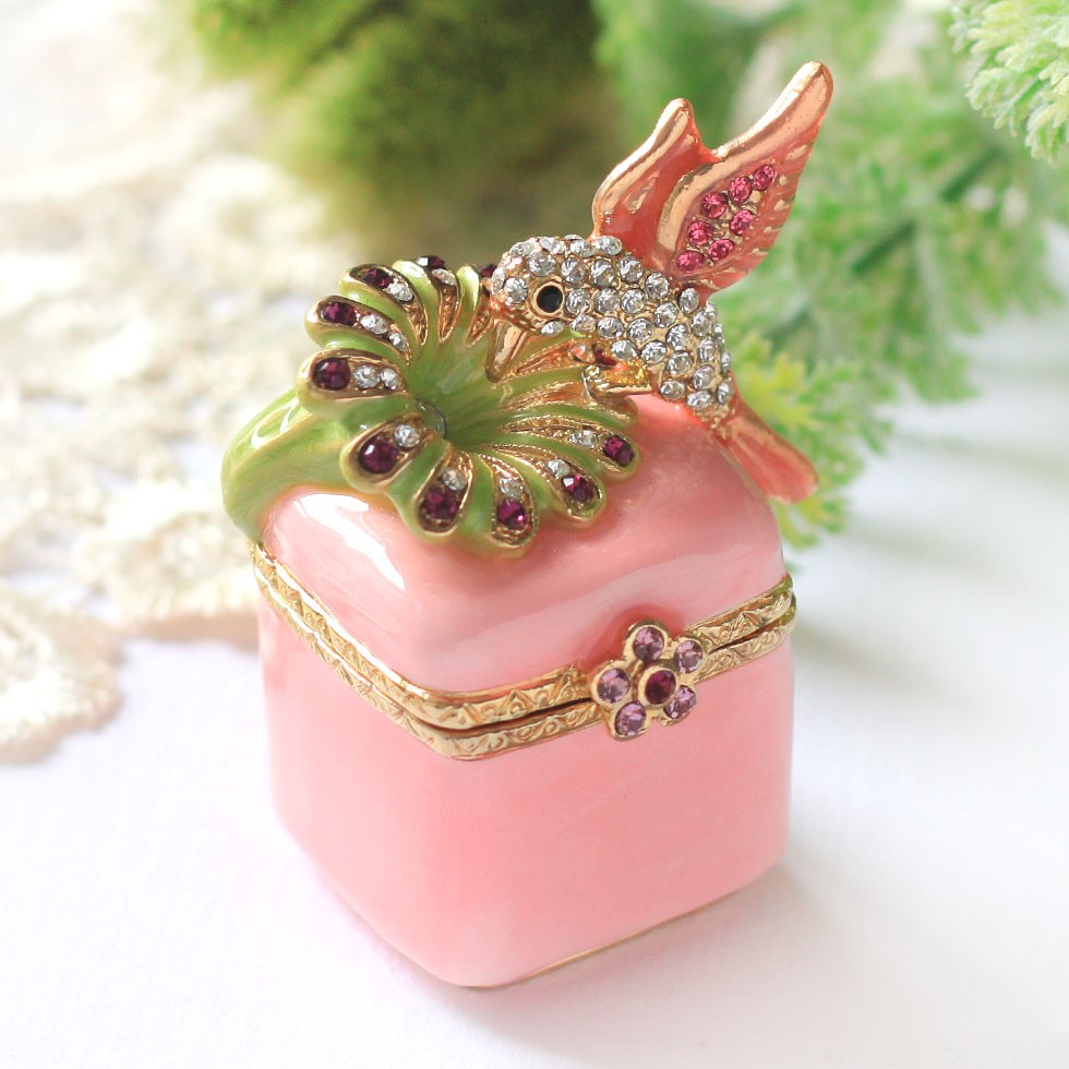 | ジュエリーボックスと言えば、指輪やピアス、ネックレスなどのアクセサリーを入れる引き出し型のケースを思い浮かべる方が多いかもしれません。 ピィアースのジュエリーボックスは、動物や花などをモチーフに作られ、合金製でずっしりとした重さがあります。また高品質のクリスタルガラスを贅沢に使用。まるでジュエリーボックスそのものが宝石のような、高級感溢れる仕上がりです。 小物入れとしても使えるように開閉口には磁石が取り付けてあり、アクセサリーなどなくしやすいアイテムの収納ができます。キラキラと美しく輝く宝石箱は、そのまま飾って楽しめるインテリア雑貨として多くの方に愛されています。 国内トップクラスのジュエリーボックスメーカーであるピィアースは、2004年ごろから本格的に宝石箱の製造を始め、現在のジュエリーボックスはなんと300種類以上。大規模展示会でもご好評いただいており、全国有名百貨店でも販売されています。 自社工場でひとつひとつ丁寧に手作りし、原型作成、研磨、加工、着色、小さなクリスタルガラスの取り付けなども全て手作業で行われるこだわりのハンドメイド品。完成後は厳しい検品の後、丁寧に梱包作業をしお客様にお届けしております。 ピィアース商品は、全国有名百貨店および全国有名宝石店チェーンにてお取り扱いいただいている高品質商品です。 ★自分へのご褒美に…コレクションして並べて飾ると、さらにかわいらしさUP! ★恋人へのプレゼント…中にアクセサリーを入れて、サプライズな贈り物として ★家族への感謝ギフト…お母さんや姉妹へ、日頃のありがとうの気持ちを込めて ★誕生日プレゼント…お友達の喜ぶ顔が見たいから、いつもと違うキラキラギフトを ★小さな女の子へ…まるでお姫様が使っているようなキラキラ宝石箱は女の子の憧れ! |