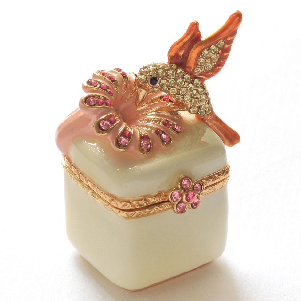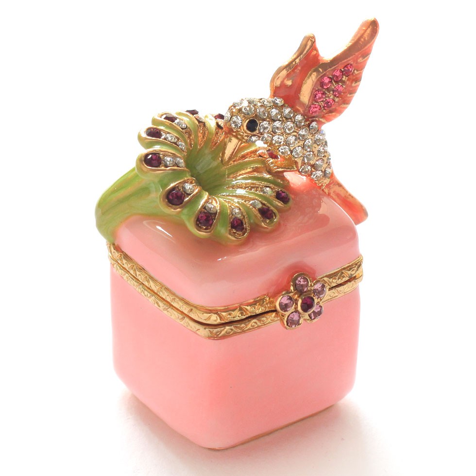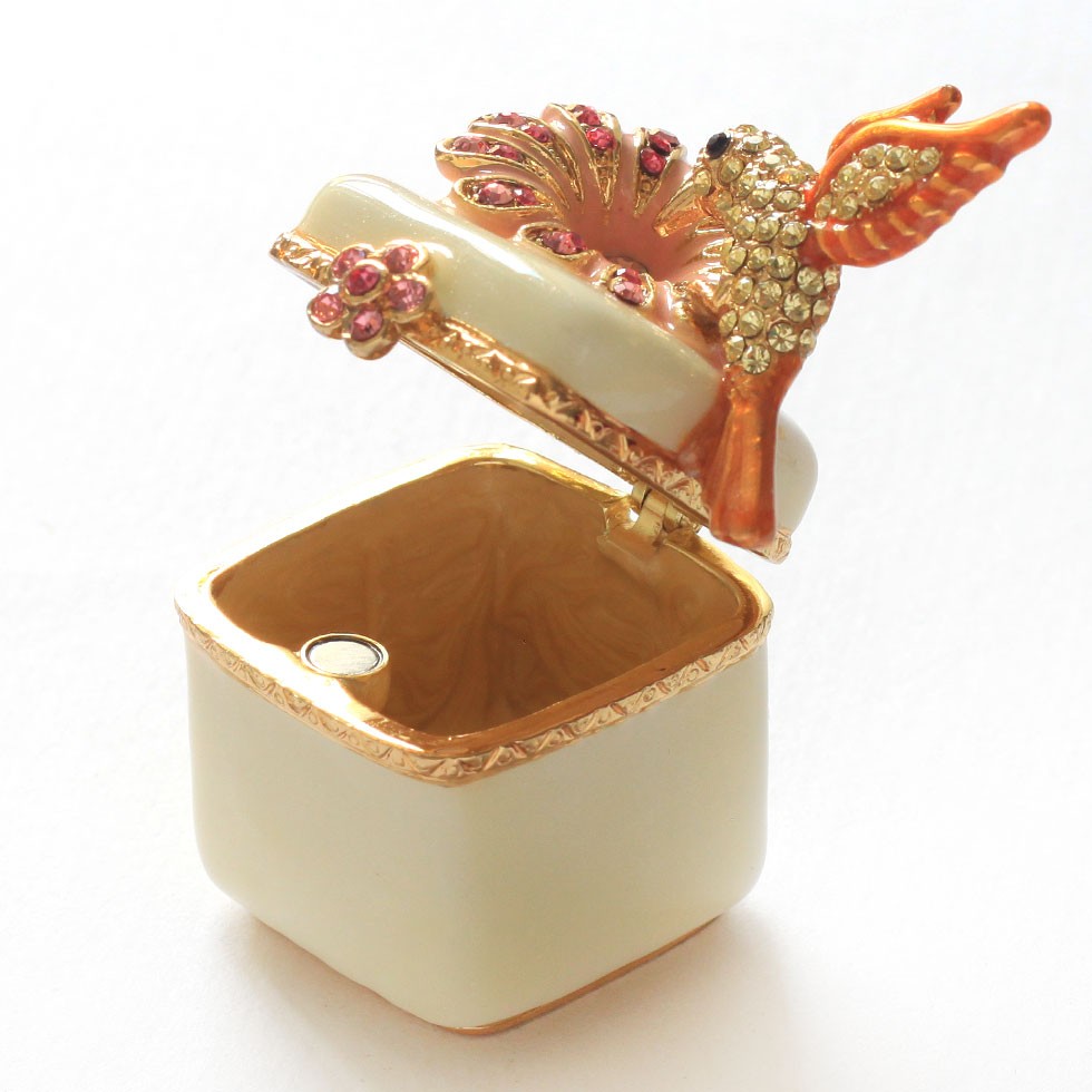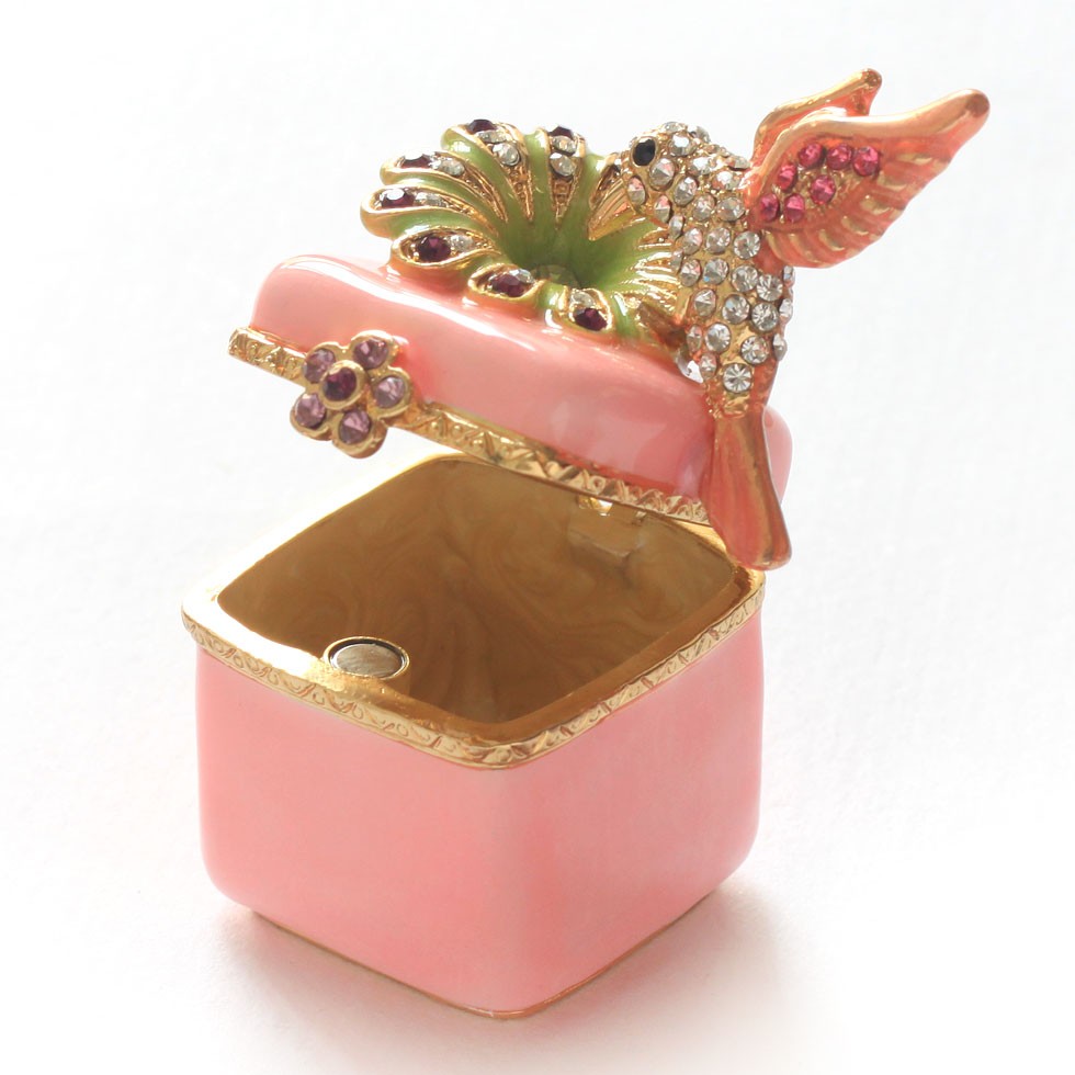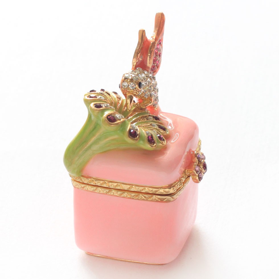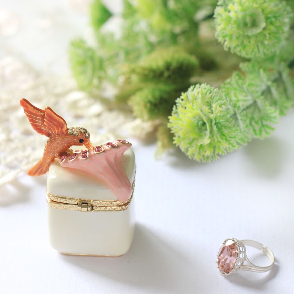 | ジュエリーボックスと言えば、指輪やピアス、ネックレスなどのアクセサリーを入れる引き出し型のケースを思い浮かべる方が多いかもしれません。 ピィアースのジュエリーボックスは、動物や花などをモチーフに作られ、合金製でずっしりとした重さがあります。また高品質のクリスタルガラスを贅沢に使用。まるでジュエリーボックスそのものが宝石のような、高級感溢れる仕上がりです。 小物入れとしても使えるように開閉口には磁石が取り付けてあり、アクセサリーなどなくしやすいアイテムの収納ができます。キラキラと美しく輝く宝石箱は、そのまま飾って楽しめるインテリア雑貨として多くの方に愛されています。 国内トップクラスのジュエリーボックスメーカーであるピィアースは、2004年ごろから本格的に宝石箱の製造を始め、現在のジュエリーボックスはなんと300種類以上。大規模展示会でもご好評いただいており、全国有名百貨店でも販売されています。 自社工場でひとつひとつ丁寧に手作りし、原型作成、研磨、加工、着色、小さなクリスタルガラスの取り付けなども全て手作業で行われるこだわりのハンドメイド品。完成後は厳しい検品の後、丁寧に梱包作業をしお客様にお届けしております。 ピィアース商品は、全国有名百貨店および全国有名宝石店チェーンにてお取り扱いいただいている高品質商品です。 ★自分へのご褒美に…コレクションして並べて飾ると、さらにかわいらしさUP! ★恋人へのプレゼント…中にアクセサリーを入れて、サプライズな贈り物として ★家族への感謝ギフト…お母さんや姉妹へ、日頃のありがとうの気持ちを込めて ★誕生日プレゼント…お友達の喜ぶ顔が見たいから、いつもと違うキラキラギフトを ★小さな女の子へ…まるでお姫様が使っているようなキラキラ宝石箱は女の子の憧れ! |