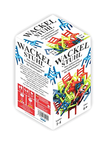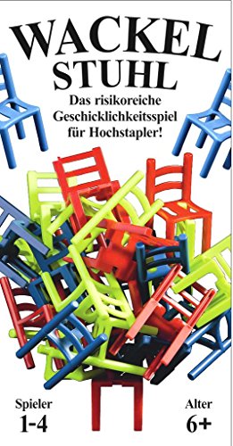 Mit viel Geschick und Glück gilt es eine Stuhl auf der wackligen Stuhlpyramide zu platzieren, ohne das alles zusammenfällt. Inhalt 24 Stühle in 3 Farben, 1 Spezialwürfel, 30 Spielchips, 1 SpielanleitungFeature