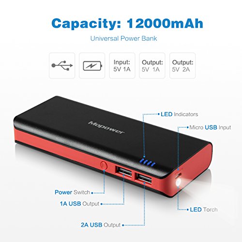-. Binding : Wireless Phone Accessory -. Brand : Mopower -. Feature : Large 12000mAh capacity. Grade A Li-ion polymer cell and premium microchips create high-quality portable charger / Input: Micro USB 5V/1A; Two Output: USB 5V/1A & 5V/2A ensure charge two devices the same time to enjoy simple life / Maximize compatibility with Android, Apple or other devices by enabling charge speeds of up to 1 amps, add more than a full charge or 4 hours of additional talk time / Standby time up to 6 months after fully charged. 500+ recharge cycles over the life of the battery;Pocket size,stylish, compact, lightweight design fits easily into any pocket or bag / Multiple protection system inside for safety. It's designed for avoiding overcharge, overvoltage, overcurrent, over temperature and short circuit to ensure reliability and safety. -. Label : Mopower Technology -. Manufacturer : Mopower Technology -. Model : PB502 -. PackageQuantity : 1 -. ProductGroup : Wireless -. ProductTypeName : WIRELESS_ACCESSORY -. Publisher : Mopower Technology -. Studio : Mopower Technology -. Title : Mopower 12000mAh Portable Power Bank Dual Port External Battery Pack Backup Charger for iPad Air mini,iPhone 6 Plus 6s,Samsung Galaxy S6 Note Edge,HTC One,Motorola Atrix Mobile Digital Devices