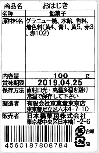 原材料:グラニュー糖、水飴、着色料(黄3、黄4、黄5、青1)、香料