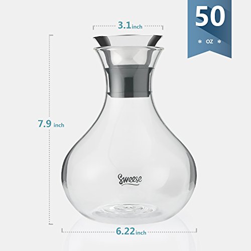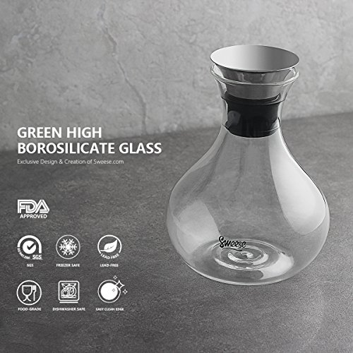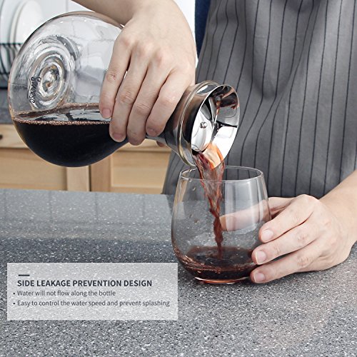 Comfortable and practical design Glass water pitcher features pratical design. The wide base minimize being easily tipped over; the small neck helps ensure safe grip and enables one-handed pouring . Besides, there is no handle sticking out to take up extra space in your fridge. Moreover, borosilicate glass is an appropriate thickness. So this carafe is easy to lift, pass, and pour, even when full