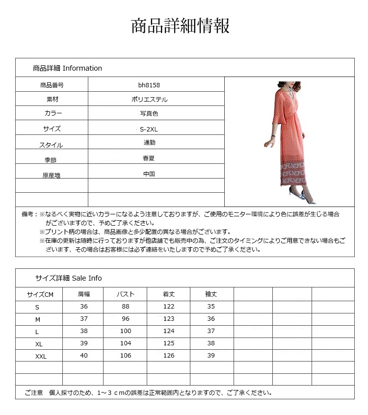 ■素材:ポリエステル■カラー:写真色■サイズ:Sバスト88袖丈35着丈122肩幅36Mバスト96袖丈36着丈123肩幅37Lバスト100袖丈37着丈124肩幅38XLバスト104袖丈38着丈125肩幅392XLバスト106袖丈39着丈126肩幅40■原産地:中国