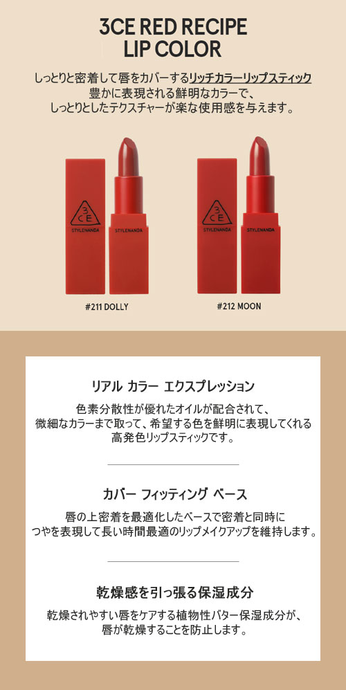 【韓国直送】 韓国コスメ <3CE> RED RECIPE LIP COLOR (レッドレシピ リップカラー リップスティック/全2色1択)