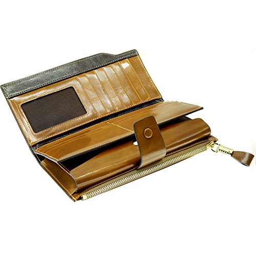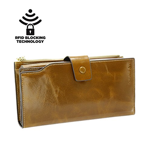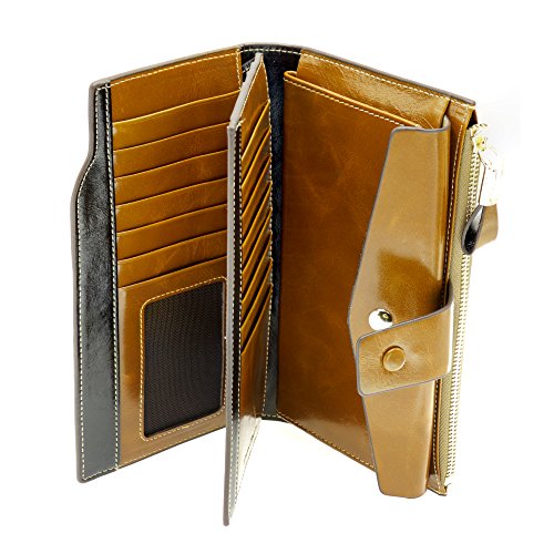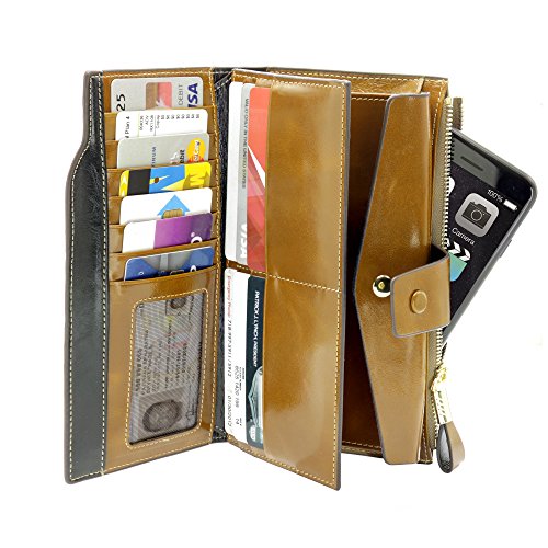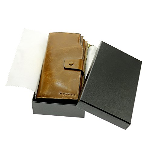 BROWN GENUINE LEATHER clutch wallet for women that's modern, elegant and luxurious. Features top grain oil wax leather. Dimensions of the wallet are 7.5 x 3.9 x 0.8 inches.