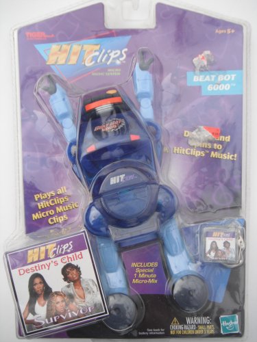 -. Binding : Toy -. Brand : Hit Clips -. EAN : 0076930665589 -. Feature : Hit Clips Micro Music System BEAT BOT 6000 Dancing Robot. / Includes special 1 minute micro-mix of Destiny's Child "SUPVIVOP". / Plays all Hit Clips micro Music clips! Dances and spins to Hit Clips Music! / Made by Tiger Electronics in 2001 and long out of production. -. Label : Tiger Electronics -. Manufacturer : Tiger Electronics -. PackageQuantity : 1 -. ProductGroup : Toy -. ProductTypeName : TOYS_AND_GAMES -. Publisher : Tiger Electronics -. Studio : Tiger Electronics -. Title : Hit Clips Micro Music System BEAT BOT 6000 Dancing Robot W/Destiny's Child "SURVIVOR" Hit Clips (2001 Tiger Electronics) -. UPC : 076930665589