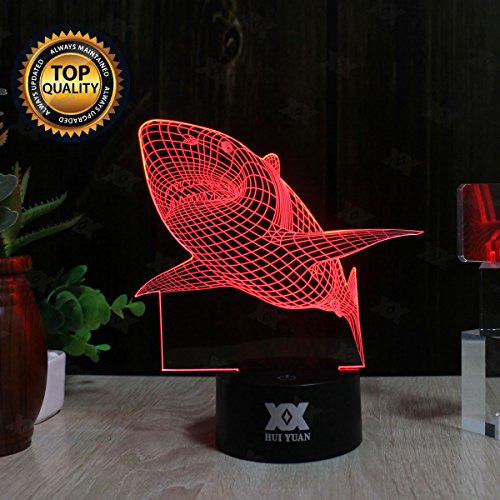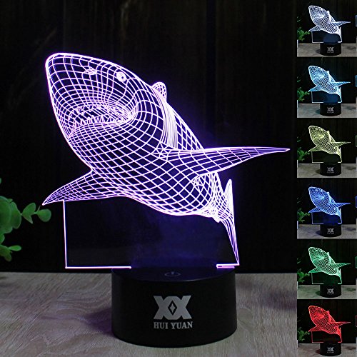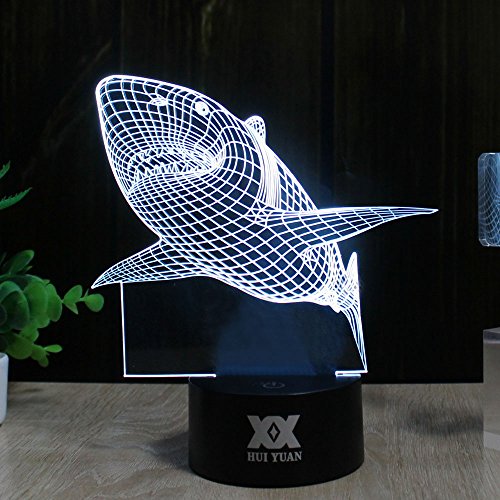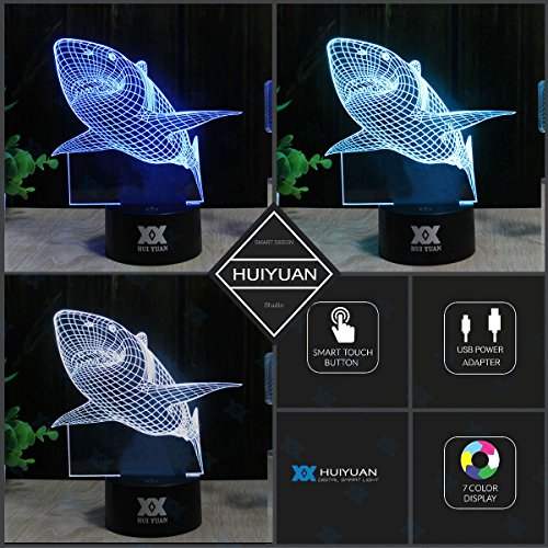 -. Brand : Huiyuan -. Color : Shark -. EAN : 8419221554506 -. Feature : Energy saving with USB connection to provide power / Easily operate, can choose one colour as you want or 7 colour dynamic changing / Best soft light at night when sleep / Shows 3D illusion vividly especially in darkess or at night / Specialized in image design,will offer more popular images as market need -. Label : HUI YUAN -. Manufacturer : HUI YUAN -. MPN : H3D1 -. PackageQuantity : 1 -. PartNumber : H3D1 -. ProductGroup : Lighting -. ProductTypeName : HOME_LIGHTING_AND_LAMPS -. Publisher : HUI YUAN -. Studio : HUI YUAN -. Title : Optical Illusions 3D Lamp Touch Control LED Night Lights Decor Lights Animal Image Series 7 Colours Changes Best Gifts for Kid and Room&Dest Decoration