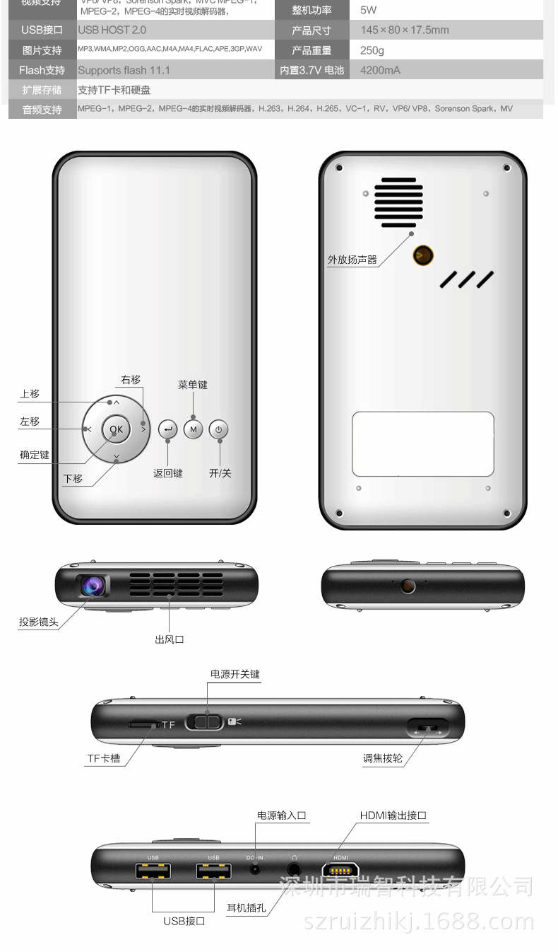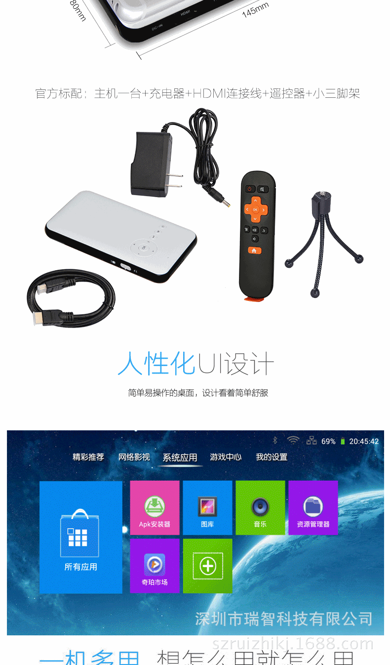 功能:可以插U盘,移动硬盘,TF卡,无线wifi,电脑带HDMI接口可另配HDMI线连电脑。