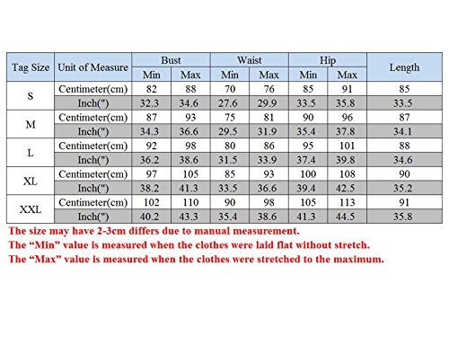 Large=US 8-10: ---Bust:36.2-38.6" ---Waist :31.5-33.9" ---Hip :37.4-39.8" ---Length :34.6"