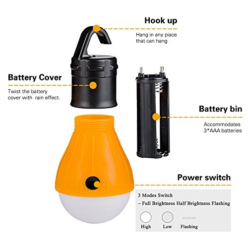 Tent led light bulbs 4 pack,ANENER portable waterproof cob lamp lantern for camping hiking fishing emergency light, battery powered camping equipment gear gadgets lamp for outdoor & indoor features: What is the most important point for camping lantern? That should be lightweight and water resistant. This handy led tent light is only 75 gram after you input three batteries. Please note that the 3 x aaa batteries are not included for sale. It comes with an adjustable light that can brighten wide area or provide a dim and warm cozy glow. Great choice for your camping equipment and gear. This camping lantern is built with high-quality water resistant abs materials, which is well enough to support your outdoor and indoor activities such as camping, hiking, hunting, mountaineering, fishing and so on. Due to its specific design, the tent light can be hang on tree, rope or the tent. You can also use it as a backup emergency light in your car. Specification: Material: Abs power supply: 3 x aaa batteries (not included) package included: 4 packs product application: Night light, emergency lighting, outdoor playing, camping, hiking, hunting, mountaineering, fishing, reading are not appropriate. Routine maintenance: 1,light up to 10 hours with full battery capacity in high light (aaa batteries not included),please take enough batteries when longer hiking trip. 2,please replace the battery in time when the light dimmed to ensure the longer lasting use.Feature