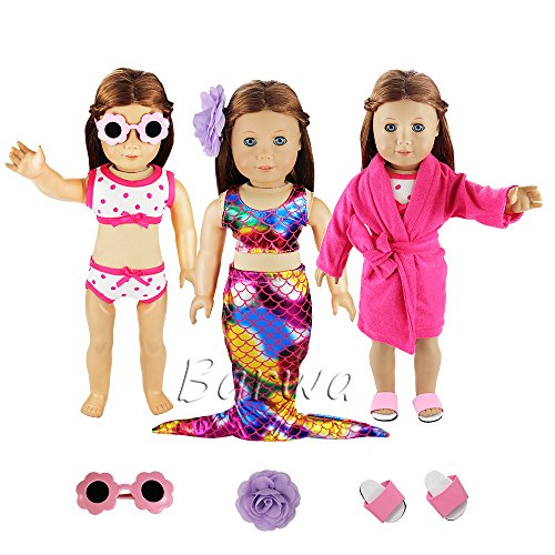 -. Feature : Package Included: 3 sets clothes outfits for 18 inch american girl doll ( including mermaid dress with purple flower hair clip, water point swimsuit with sunglasses, pink pajamas with Slippers) / Handmade summer clothes, all the items and material are triple checked for sewing quality. / If you need the item within 5 days, please select the item fulfilled by Amazon. About the item shipped from China, it normally takes about 8-14 days for delivery. During holiday season( form Nov to Dec), it may takes 14-24 business days. / High quality fabrics and cotton, easy to put on, machine washable, safety tested. / Made by Barwa, Leading Doll Clothes Manufacturer.
