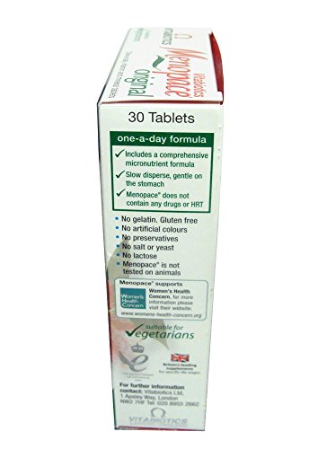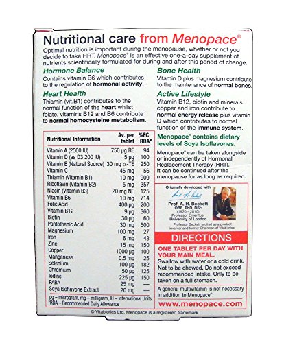 -. Feature : Helping to maintain menopausal health menopace provides vitamin b complex, which is involved in the maintenance of the nervous system and brain function and may help contribute to a normal sense of well-being. It also contains moderate dietary levels (20mg) of soy isoflavone extract, to provide daidzin, glycetine and genisein. Isoflavones are naturally occurring plant compounds that studies have shown may be useful for women during this time / Supple skin oestrogen has a positive effect on the production of collagen, a substance that forms part of the bone matrix and helps keep skin supple and taught. After the menopause, oestrogen levels and hence collagen production can significantly decline. Menopace includes vitamin c to help the body maintain collagen production, along with copper, zinc and other minerals important to collagen deposition. / Minerals to keep bones strong bone health is particularly important for women during and after the menopause. Menopace provides magnesium, zinc and vitamin d, to help maintain strong bones. These nutrients can help to facilitate bone mineralization, the uptake of calcium and may help maintain bone density. Menopace is designed to be taken in conjunction with a calcium supplement such as osteocare . / Natural balance the secretion of ovarian hormones oestrogen and progesterone declines around the menopause.