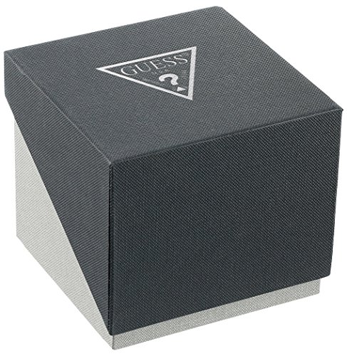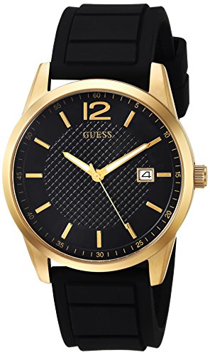 Watch Sizing Guide This classy watch with minimalistic black dial and date window provides the perfect level of comfort with its silicone strap. A versatile style, perfect for her too. Stainless steel case. Synthetic strap with adjustable buckle closure. Round face. Three-hand analog display with quartz movement. Dial features gold-tone hands and hour markers, date display window, minute track, and GUESS® detailing. Water resistant 330 feet. Display case included. Imported. Guess Watch Warranty Measurements: Case Height: 47 mm Case Width: 47 mm Case Depth: 16 mm Band Width: 25 2⁄5 mm Band Circumference/Length: 9 1⁄2 in Weight: 2.2 oz This product may have a manufacturer's warranty. Please visit the manufacturer's website or contact us at warranty@support.zappos.com for full manufacturer warranty details.Feature