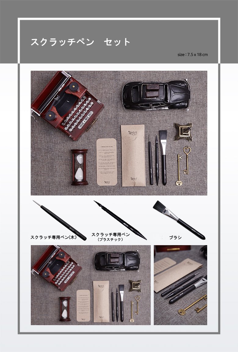 ■ Scratch dedicated pen set ■ Production place: Made in korea ■ Size: 7.5 cm × 18 cm ■ Scratch dedicated pen (wooden) + scratch dedicated pen (plastic) + brush ■ Distributor: Seiko Polision TEL: 03-5879