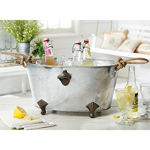 Product DescriptionGalvanized beverage tub from Mud Pie has rope handles, metal claw feet and attached bottle opener. Measures 9.5" x 17".0