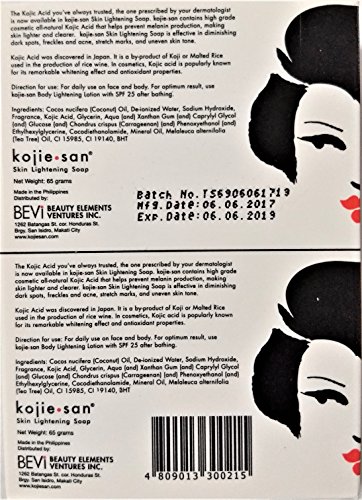 INGREDIENTS: Cocos nucifera (Coconut) Oil, De-ionized Water, Sodium Hydroxide, Fragrance, Kojic Acid, Glycerin, Aqua (and) Xanthan Gum (and) Caprylyl Glycol (and) Glucose (and) Chondrus crispus (Carrageenan) (and) Phenoxyethanol (and) Ethylhexylglycerine, Cocodiethanolamide, Mineral Oil, Melaleuca alternifolia (Tea Tree) Oil, Cl 15985, Cl 19140, BHT HOW TO USE: Lather soap and apply to treatment areas. Leave the soap on for up to 30 seconds. Apply once per day and increase to twice a day if well tolerated. If dryness occurs follow with a moisturizing cream. ONLY THE LARGE SIZE 135G BAR HAS THE KOJIC ACID STAMP, THE 100G AND 65G DO NOT.Feature