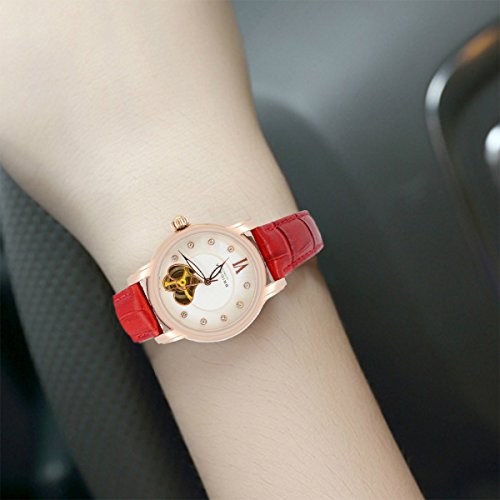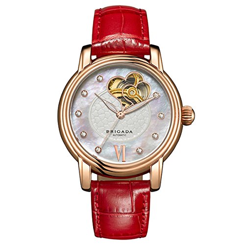 -. Binding : Watch -. Brand : BRIGADA -. Department : Womens -. EAN : 0190203897436 -. Feature : Automatic movement with analog display / 34 mm rose gold-plated case, hands/ markers with mineral glass dial window / Round watch with textured white dial and rhinestone indices; the inner movement can be seen directly from transparent watch back cover / South Africa imported genuine calfskin leather band with metal buckle closure / Slightly water-resistant: generally, suitable for hands washing and rain splashing, but not swimming or bathing -. Label : Brigada -. Manufacturer : Brigada -. Model : BJDMW-6007 -. MPN : BJDMW-6007L-1 -. PackageQuantity : 1 -. PartNumber : BJDMW-6007L-1 -. ProductGroup : Watch -. ProductTypeName : WATCH -. Publisher : Brigada -. Studio : Brigada -. Title : Lady Retro Unique Hollow Automatic Mechanical Watch with Leather Band -. UPC : 190203897436