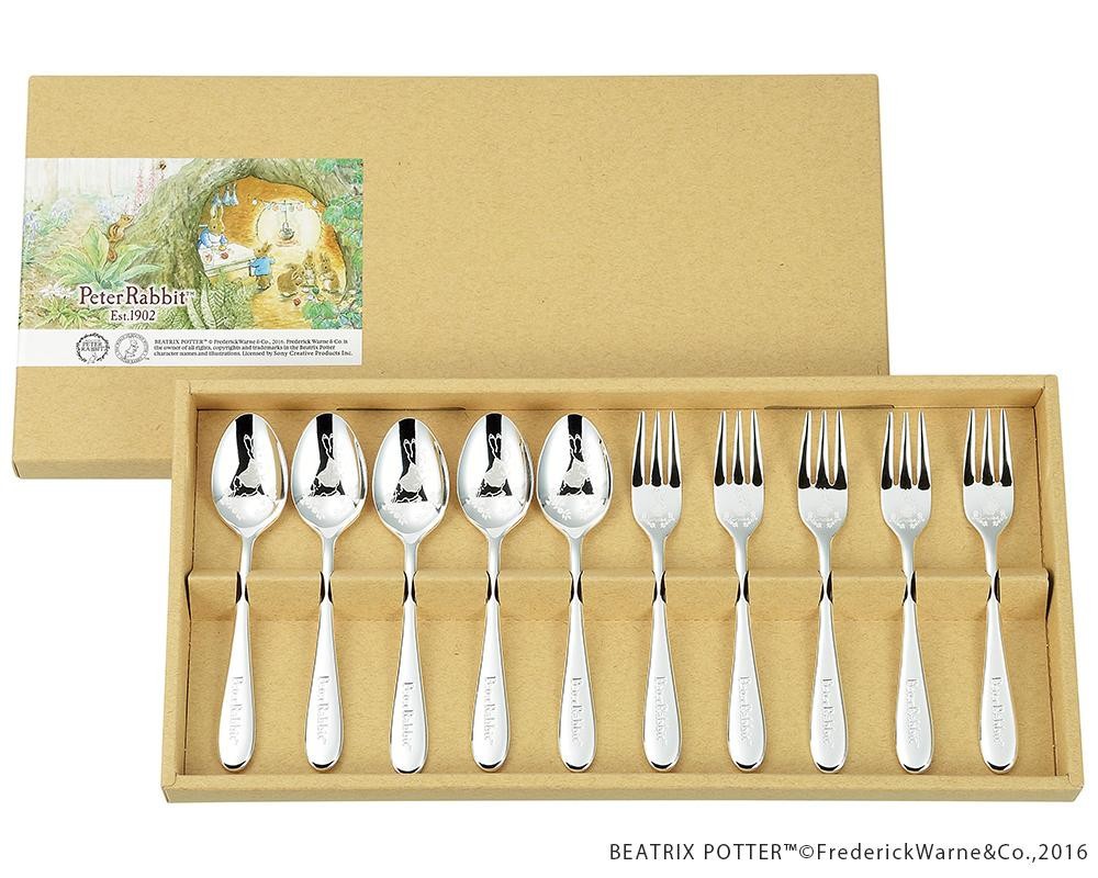 fk094igrjs皿中レーザーシリーズのカトラリーセットですサイズ全長(約)/ティースプーン:132mm、ケーキフォーク:134mm個装サイズ:16×33×3cm重量(約)ティースプーン:23g、ケーキフォーク:20g個装重量:311g素材・材質ステンレススチール(銀メッキ)仕様食洗機・乾燥機不可セット内容ティースプーン・ケーキフォーク×各5本製造国日本可愛らしいピーターラビットのカトラリーセット皿中レーザーシリーズのカトラリーセットです