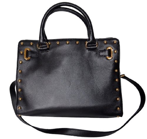 - Feature : Michael Kors Black Leather with Stud Details / 4" Drop Double Leather Handles with 18" Drop Shoulder Strap / Measures: 12.25" (W) x 9.5" (H) x 4.75" (D) / Belted top with MK logo plate; snap closure / One zip pocket, 4 multifunction slip pockets