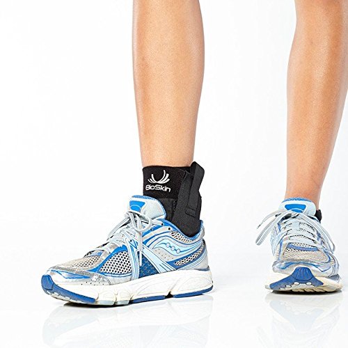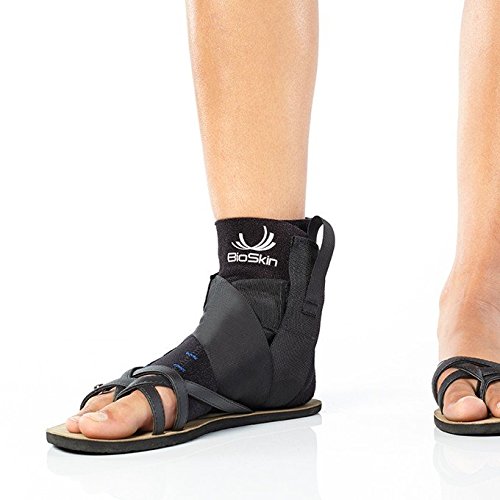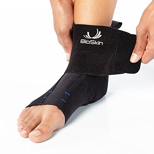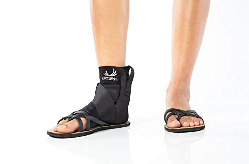-. Binding : Misc. -. Brand : BioSkin -. Color : Black -. Feature : Ideal for reducing pain and swelling after ankle injury. High compression reduces swelling for faster recovery and improved range of motion. / Thin and comfortable--easily fits in most shoes. / Podiatrist recommended for recovery. Simple application. Hypo-allergenic: Latex free and neoprene free. / Universal left or right. See size chart in second image for sizing information. -. IsAdultProduct : 0 -. IsAutographed : 0 -. IsMemorabilia : 0 -. Label : BioSkin -. Manufacturer : BioSkin -. PackageQuantity : 1 -. ProductGroup : Sports -. ProductTypeName : SPORTING_GOODS -. Publisher : BioSkin -. Studio : BioSkin -. Title : AFTR Ankle Brace - For Swelling Control and Stabilization - by BioSkin
