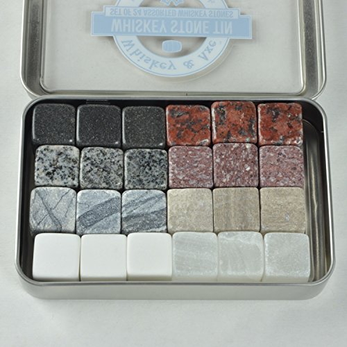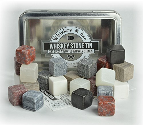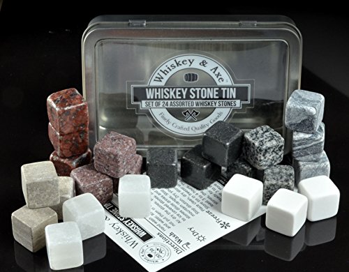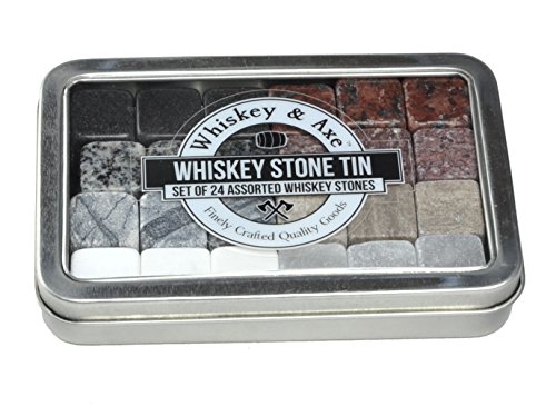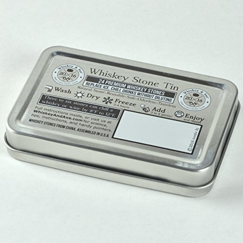Studio : Whiskey Axe Publisher : Whiskey Axe Product Description Our premium whiskey stones are finely crafted tools for experiencing whiskey. They add a gentle chill to your whiskey without the dilution or numbing cold of ice, which means you can fully experience the flavors you were meant to experience. Good whiskey shouldn't be ice cold or watered down. ........HOW ARE THEY USED? ........ Gently adding a few of our finely crafted whiskey stones to your whiskey can chill its temperature by 8-18 degrees F without the dilution or the overpowering cold of ice. With a slight chill, your whiskey can open up to fully experience its flavor and complexity. Want chillier? Just add more stones. .........WHAT ARE THE STEPS TO USE THEM? .........1) Wash, rinse, and dry. 2) Store stones in tin and freeze for at least 3-4 hours. 3) When ready, gently place 3-6 stones in glass and add 2-3 oz of drink. 4) Swirl drink for a few minutes to help chill. 5) Enjoy. 6) Repeat. .........NOT A WHISKEY DRINKER? .........Though named for whisky, whiskey stones work with wine, tequila, vodka, and other spirits. Keep your drink chilled, yet not iced or watered down, so you can fully experience its flavor. A fine Chardonnay on a hot summer evening deserves better than to be watered down with ice cubes. Sensitive to hot? Like tea? Whiskey stones can cool off your drink to a more comfortable temperature. .........WHY SO MANY? .........Each Whiskey Stone Tin contains 24 whiskey stones. What this means is you can drink with friends. Or you can drink a lot all by yourself. We're not here to judge. .........WHAT IS INCLUDED? .........Each Whiskey AxeTM Assorted Whiskey Stone Tin Set contains: (1) Windowed storage tin (5 1/2" x 3 5/8" x 7/8"). (1) Waterproof set of cleverly written directions. (24) Whiskey Stones including 3 of each of these: Black Granite, Brown Marble, Gray Blue Marble, Red Granite, Speckled Black Granite, Speckled Mauve Granite, White Marble, and White Oynx. Each whiskey stone is 20mm /- 1mm'ish (3/4 inch). 0
