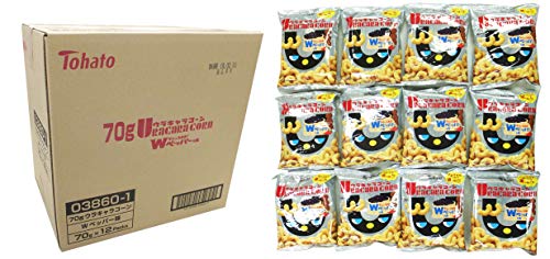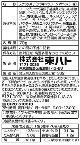 原材料:コーングリッツ(遺伝子組換えでない)、植物油脂、ポークオイル、食塩、チキンエキスパウダー、香味油、砂糖、デキストリン、ブラックペッパー、ガーリックパウダー、ポークエキスパウダー、酵母エキスパウダー、粉末醤油、唐辛子/セルロース、調味料(アミノ酸等)、卵殻未焼成Ca、香料、カラメル色素、香辛料抽出物、甘味料(スクラロース)、(一部に卵・乳成分・小麦・ごま・大豆・鶏肉・豚肉を含む)