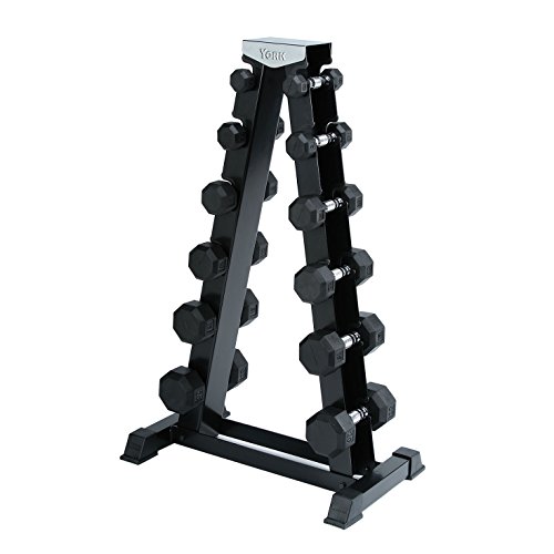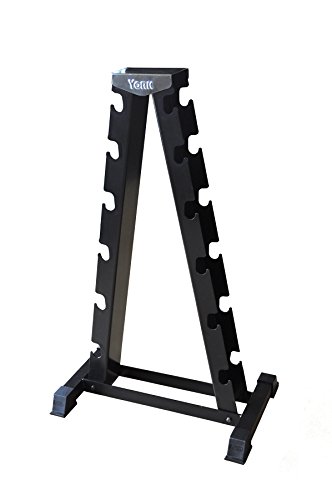 The SPRI Deluxe Rubber Dumbbell A-Frame Rack accommodates up to 6 pairs of Deluxe Rubber Dumbbells. The Rack features all-steel construction with a sturdy bolt-together design. Rack size is 44 1/2"H x 27"W x 16 1/2"D. Dumbbells not included.
