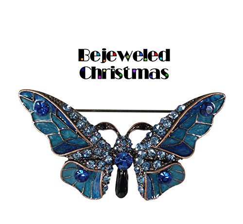 Jeweled enamelled butterfly, festive for the holidays. Looks great on a sweater, coat or jacket. About 1 1/8 inches long overall and 2 1/4 inches wide. Enamel and genuine rhinestones. Alloy. Pin back with safety C clasp. Not for children age 12 and under. Made in China.Feature