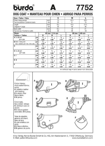 -. Binding : Office Product -. Brand : Burda -. Feature : BURDA 7752 SEWING PATTERN / DOG COATS ~ 6 STYLES -. Label : BURDA -. Manufacturer : BURDA -. Model : 7752 -. PackageQuantity : 1 -. ProductGroup : Art and Craft Supply -. ProductTypeName : ART_SUPPLIES -. Publisher : BURDA -. Studio : BURDA -. Title : BURDA 7752 DOG COATS (6 STYLES) SEWING PATTERN