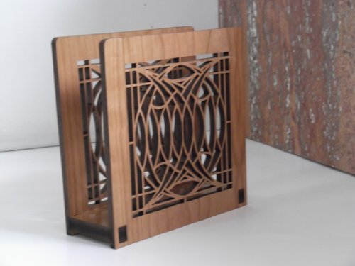 -. Color : Cherry -. Feature : Frank Lloyd Wright design inspired by the art glass design in the lights of the George Blossom House (1892 Chicago, Illinois / The design is precision cut with laser on Cherry wood. / 6" x 6" x2.5" -. Label : Lightwave Laser -. Manufacturer : Lightwave Laser -. Model : FLW-NH-01 -. ProductGroup : Kitchen -. ProductTypeName : KITCHEN -. Publisher : Lightwave Laser -. Studio : Lightwave Laser -. Title : Frank Lloyd Wright BLOSSOM HOUSE Design Laser Cut Wood Napkin Holder