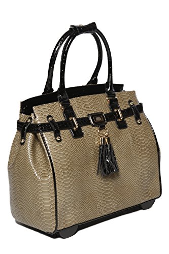 - Feature : Grey faux python snake & faux alligator leather black trim and accent belt rolling tote rolling bag. / Gold tone hardware plus lovely pendant with etched lotus blossom. Two tassel accents. / Interior removable padded pocket fits your tablet, iPad, or up to a 15.5 inch laptop (laptops are measured corner to corner diagonally). / Fully lined interior with zipper pocket and two open pockets. Zipper top closure. Exterior back side padded pocket for your iPad. / Pull out retractable handle plus durable inline style wheels for easy mobility wherever you may travel. Bag measures: 16.5" Long x 15.5" High x 8" Wide/Deep (9.25" wide/deep including back pocket). JKM and Company USA.