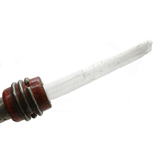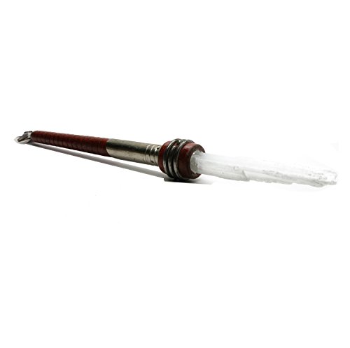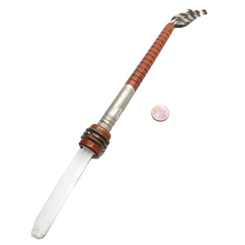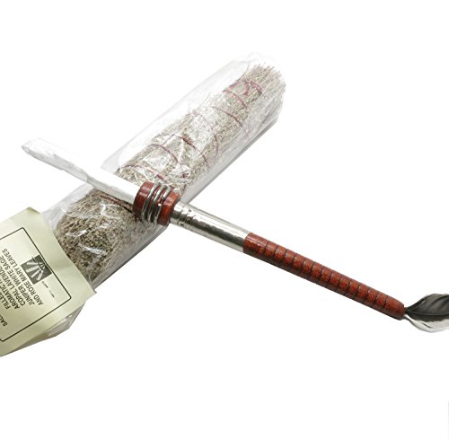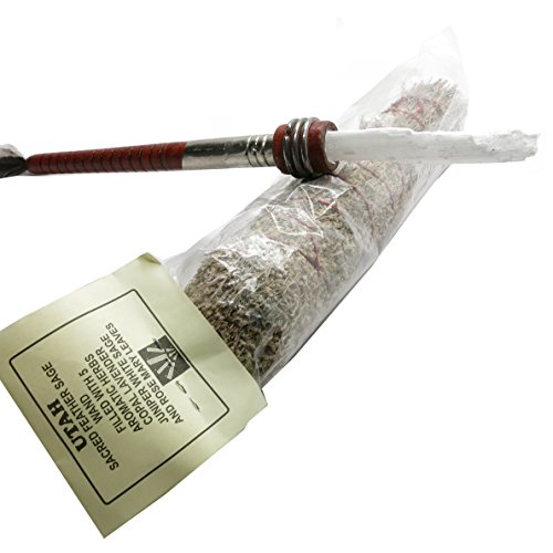One-of-Kind: Natural Selenite and Sage are included in your unique new crystal healing set. The Selenite is a white stone growing in thing blades and left in its rough blade formation. Selenite is a form of Gypsum. It is a very soft stone and should be handled with care. The rough stone is set in a vintage brown wood spool with tail feathers to use as an energy healing wand. The 13" long wand comes with a large sacred Sage wand which is filled with aromatic Copal, Lavender, Juniper, White Sage and Rosemary leaves.