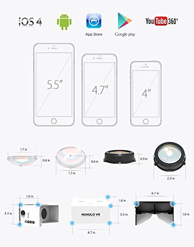 -. Binding : Electronics -. Brand : Nunulo VR -. Color : White -. Feature : Nunulo lenses will adjust, and one can select the most comfortable position / Nunulo VR significantly reduces symp of nausea, dizziness, and headaches / The imbalanced convex / Focal length adjustments / Interpupillary distance adjustments / Nunulo VR is light weight so you can play and watch more comfortably / The Nunulo VR supports smartphones with display sizes between 4.0 and 6.0 inches and is compatible with any standard VR content -. Label : Noonbit, Inc. -. Manufacturer : Noonbit, Inc. -. Model : Nunulo VR -. MPN : Nunulo VR -. PackageQuantity : 1 -. PartNumber : Nunulo VR -. ProductGroup : Speakers -. ProductTypeName : CE_ACCESSORY -. Publisher : Noonbit, Inc. -. Studio : Noonbit, Inc. -. Title : Nunulo VR Lens with Cardboard Compatible with Android & Apple Easy Setup Instructions FIT 4~6 inch Screen HD Visual Experience