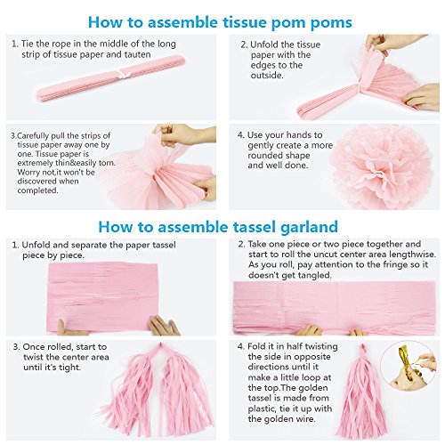 - DIY DECORATION KIT: The paper pom poms, tissue tassels,Honeycomb balls need to be assembled by yourself. Simply unfold each item and fluff up and hang them anywhere. Simpzia offers a simple instruction and video for your reference.