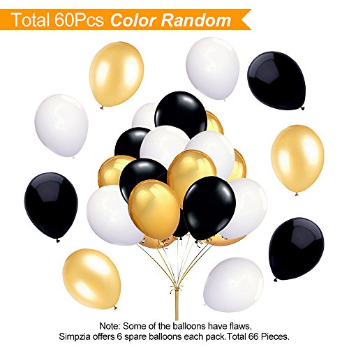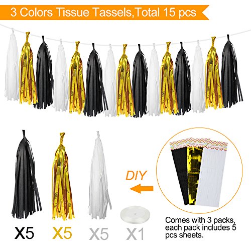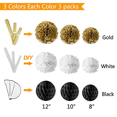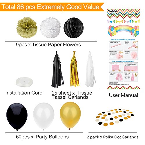 - PACKAGE CONTENT: Total 86 pcs. Each package comes with 6 pcs paper Pom Poms(White&Golden) , 3 Honeycomb balls(Black),15 pcs tissue tassels(White&Golden &Black), 60pcs mixed color Party Balloons and 2 pcs circle paper garland and 1 pcs String . Excellent value for your money!