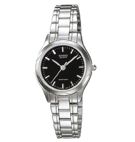 Brand, Seller, or Collection Name:Casio Model number:EAW-LTP-1275D-1A Part Number:LTP-1275D-1ADF Item Shape:Round Dial window material type:Mineral Display Type:Mineral Clasp:Fold-Over Clasp with Single Push-Button Safety Case material:Stainless Steel Case diameter:27 millimeters Case Thickness:7 millimeters Band Material:Stainless Steel Band width:11 millimeters Band Color:Silver Dial color:Black Calendar:No Special features:N/A Movement:Quartz Water resistant depth:30 Meters