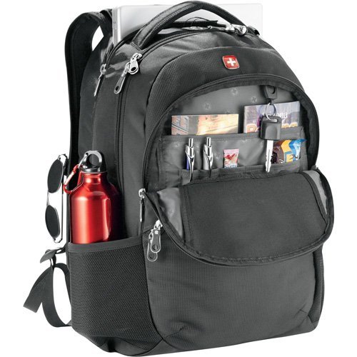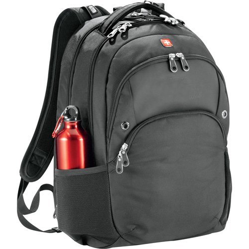 TSA-friendly design has a designated laptop-only section that unfolds to lay flat on the X-ray belt to increase your convenience, speed, and security. Side-entry laptop compartment holds most 15" laptops. Main zippered compartment with interior media pocket and earbud port access. Two front zippered accessory pockets (one with full organization and removable key fob). Side mesh pockets. Padded back panel and adjustable shoulder straps made of Wenger® Airflow moisture wicking mesh. Carry handle. Signature Wenger® lining and hardware.Feature