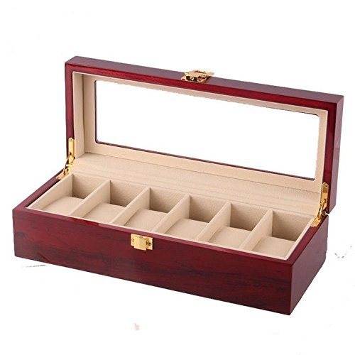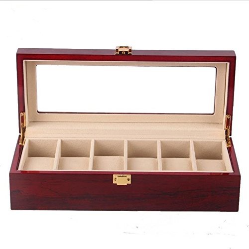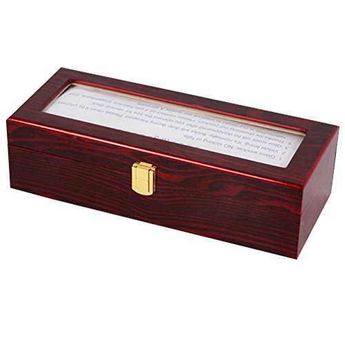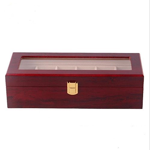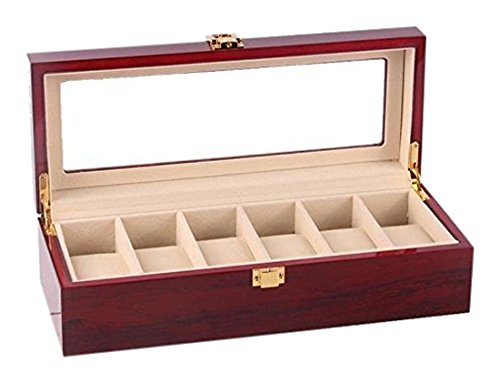 Moldiy Walnut Finish Watch Box Collection Jewelry Wooden Storage, Glass Top, Holds 6 Watches, Red