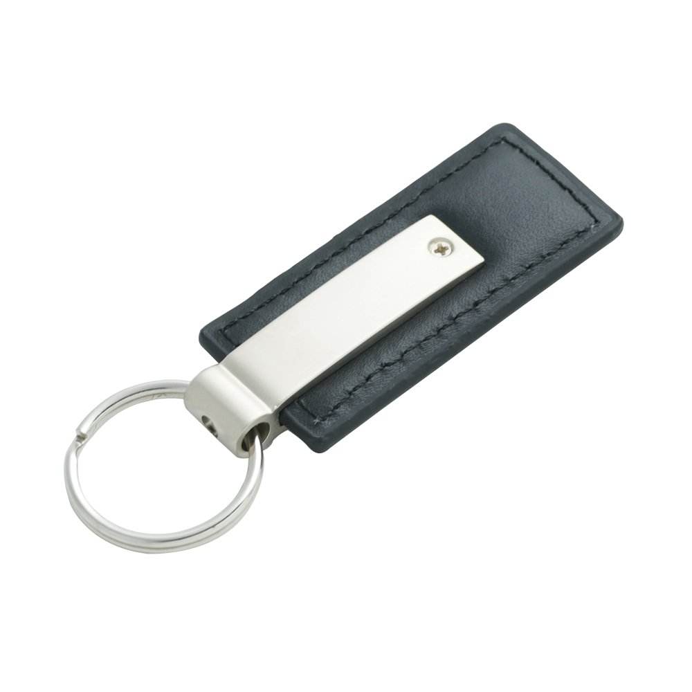 Genuine Black Leather Rectangular Silver Volvo Logo Key Chain Fob Ring