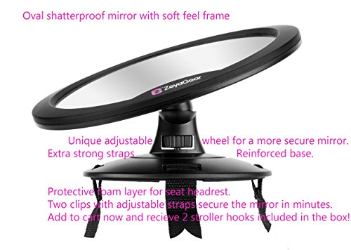 -. Feature : INSTALLS QUICKLY & EASILY: The ZeyaGear backseat baby mirror features two high-quality straps that attach easily to your headset ensuring it won't budge. We've also included two FREE stroller hooks $10value / DURABLE, ACRYLIC MIRROR DESIGN: We've carefully crafted our mirror not only to be durable and give you great vision, but to be shatterproof just in case there's an accident. / GIVES YOU PEACE OF MIND: When your infant is in a rear-facing car seat, it can be stressful thinking about whether they're sleeping, choking, or if something's wrong. Our mirror alleviates those fears and ensures you never miss a moment. / PREMIUM GUARANTEE: We believe we have the best baby mirror on the market, which is why we offer a 30-day no questions asked guarantee. If you aren't happy, return it within 30 days for a full refund. / SEE BABY CLEARLY: Superior view of your child ours offers a clearer wide angle view of your little one.