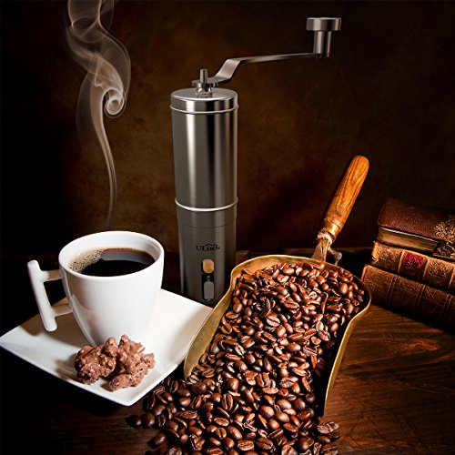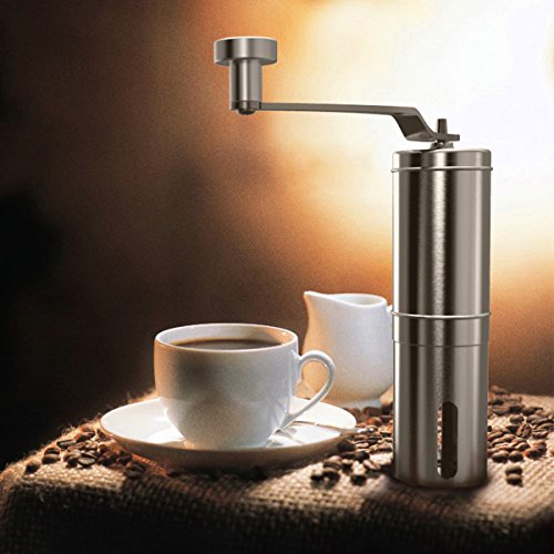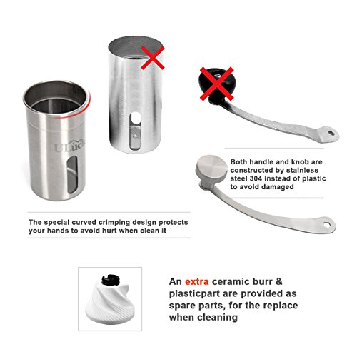 HIGH QUALITY STAINLESS STEEL: This coffee mill is made of high grade stainless steel which increases its durability, so you do not need to worry about damaging rust. With its elegant look, you could continually use it for years! Unlike other grinders with the plastic hand crank which is easily damaged, our hand crank is constructed of stainless steel for everyday use
