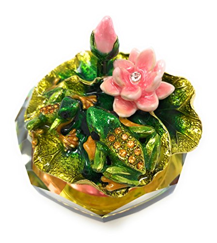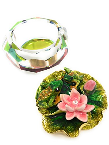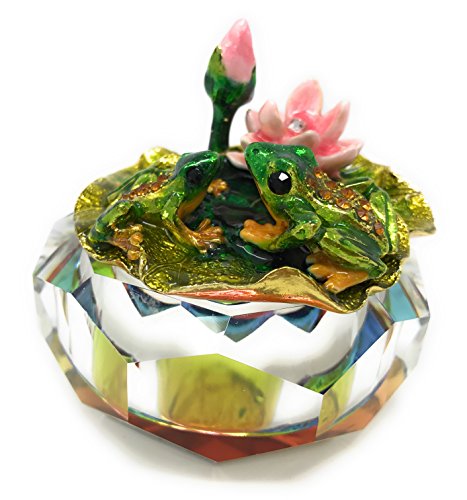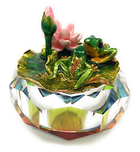 Enameled Frogs on Lily Pad with Cut Glass Trinket Box by Kubla Craft, Accented with Austrian Crystals, 2.75T