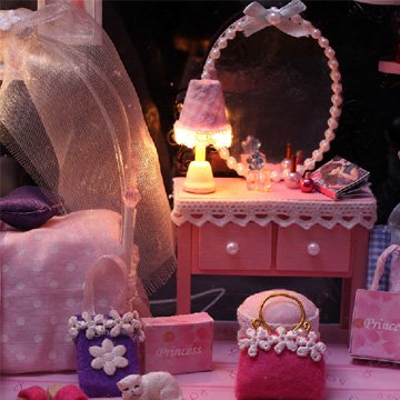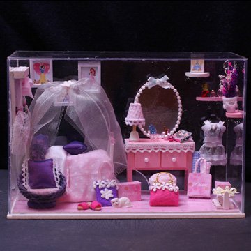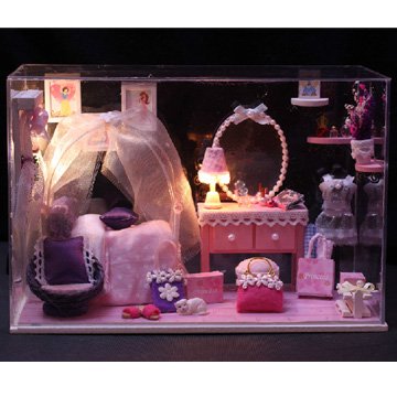 - Feature : Package: Graphic Carton Package Weight: 0.65kg Material Type: Wood, Cloth, Plastic with Environment Friendly Paint Recommended Age Range: 14 years and up / Design: warm and sweet elements-- purple pillow, dressing table, elliptical mirror to express a romantic feeling. 5 glass house can be dustproof / Made from safe, non-toxic and high-quality material to guarantee the pure colour. It comes with 2 LED lights, battery box dust cover, can deliver a relaxing atmosphere, making the dollhouse more vivid / Creative gift for friends, classmates and so on .You can also do it by yourself on the table as a decoration / Perfect presents for kids. Can not only fully develop their spatial ability and imagination with color capability, but also let the children become more careful and more patient